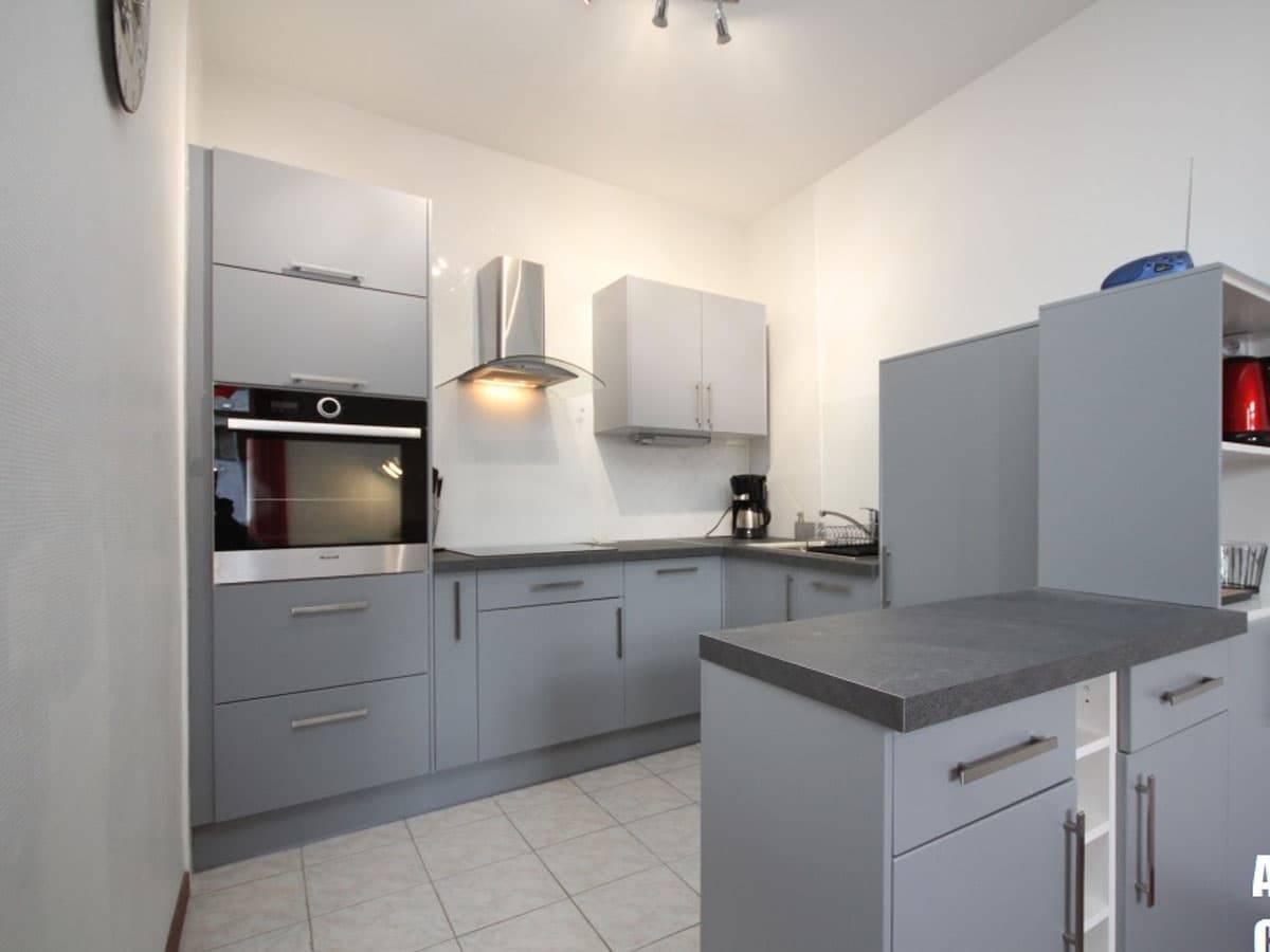 S’ouvre sur cette pièce une cuisine américaine entièrement équipée (réfrigérateur 170 L avec compartiment congélateur, lave-vaisselle 10 couverts, fours, plaques à induction) comportant de nombreux rangements dont certains en vis-à-vis de l’espace repas.