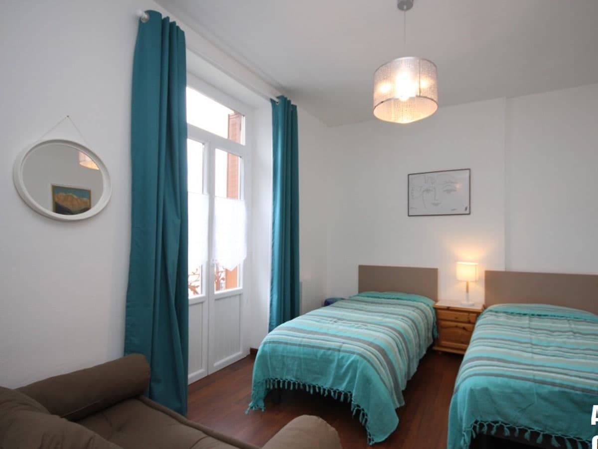 La chambre comporte, entre autres, 2 lits jumeaux de 90 cm, une grande armoire-penderie avec 3 portes et 4 tiroirs et une banquette de 140 cm de large.
