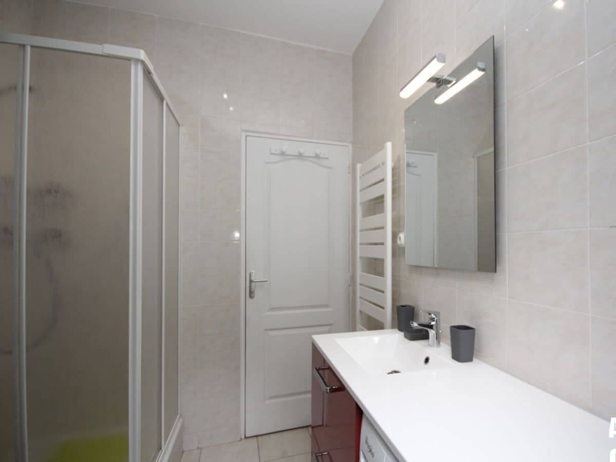 La salle d’eau est équipée d’une douche, d’un WC et d’un large plan-vasque de 135 cm sous lequel sont installés un meuble avec 3 tiroirs et un lave-linge à hublot. Un grand placard destiné aux équipements d’entretien (nettoyage, étendage du linge et repassage) abrite le chauffe-eau électrique et le groupe VMC.