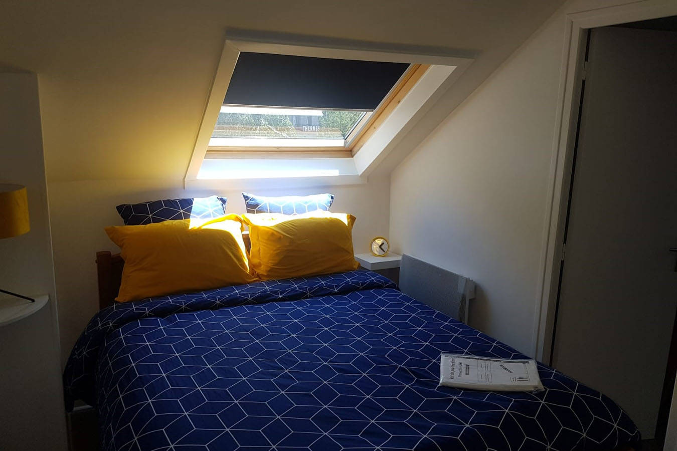 – Chambre avec couchage en 140 x 190, couette et 2 oreillers, lampe de chevet, réveil, grand placard, cintres, planche à repasser, fer à repasser, étendoir,