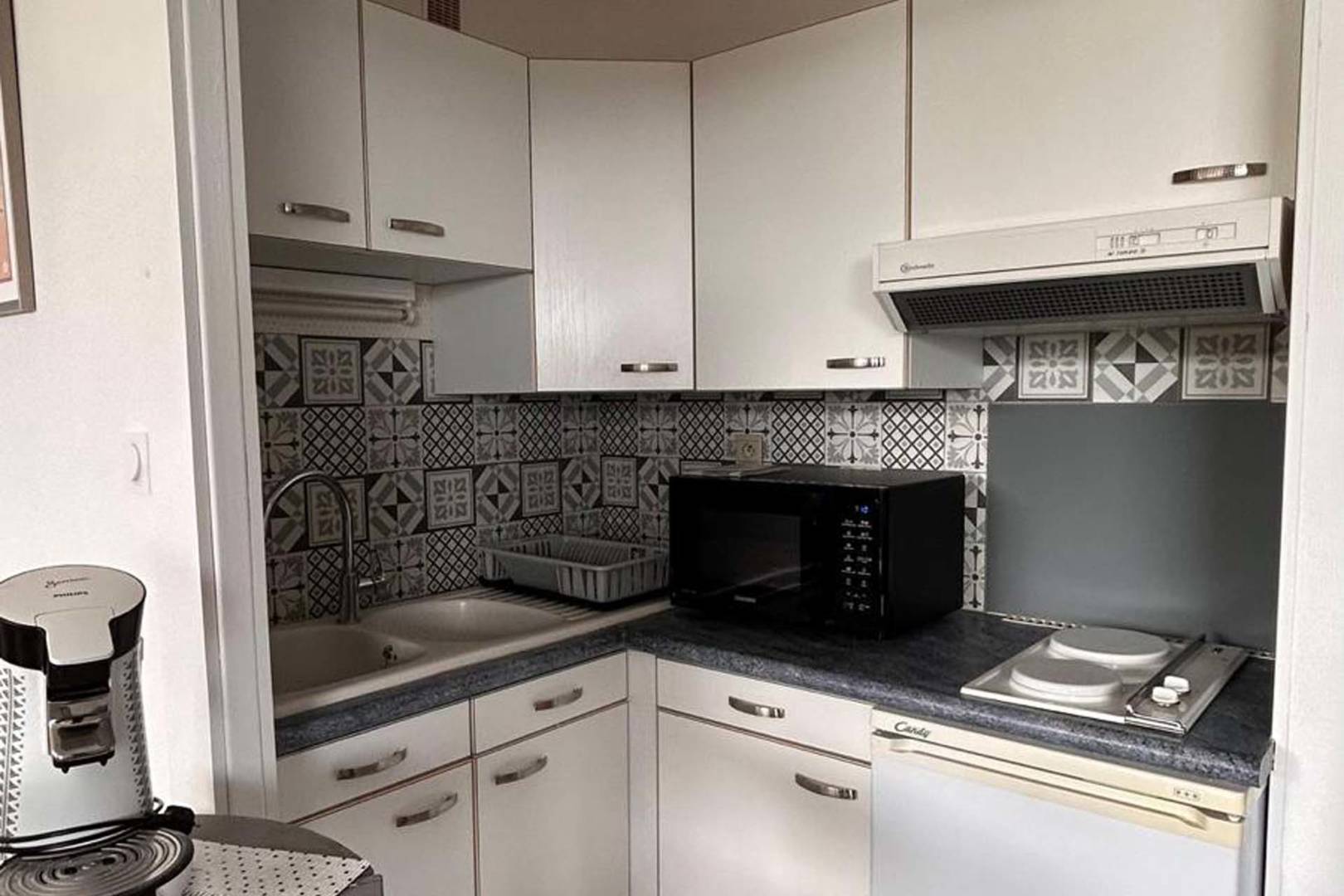 Séjour avec kitchenette (plaques de cuisson avec hotte, four – micro-ondes, cafetière classique et Senséo) et salle de bain rénovés.