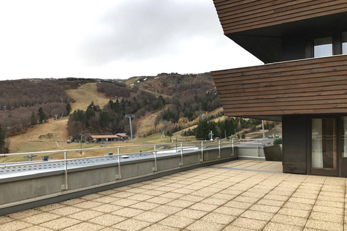 Grande terrasse privée de 120 m2 agréable et chaleureuse exposée sud. Vue sur montagne et lac.