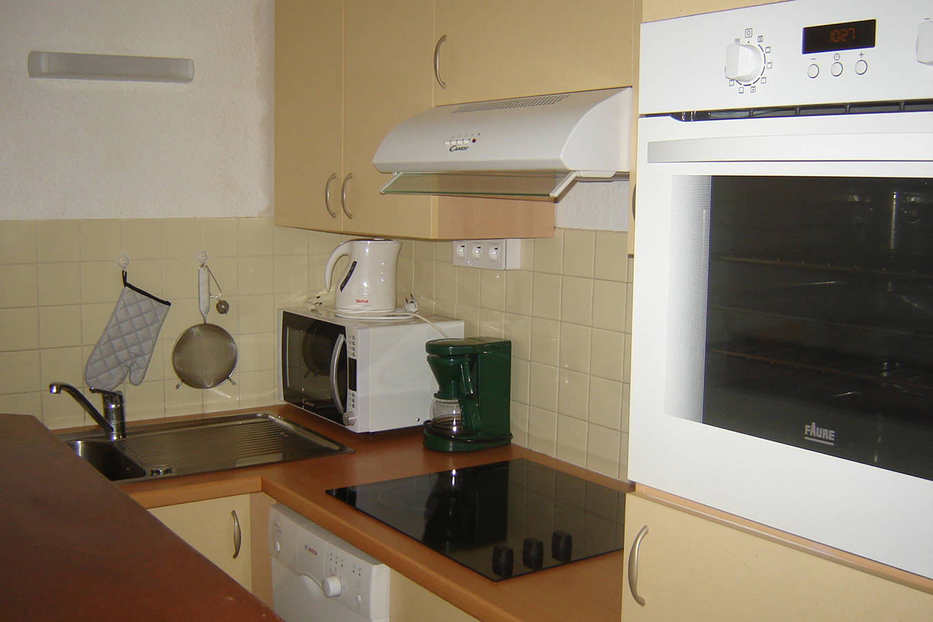 Hall d’entrée, séjour donnant sur balcon avec cuisine américaine toute équipée, cafetière électrique à capsules (capsules non fournies).