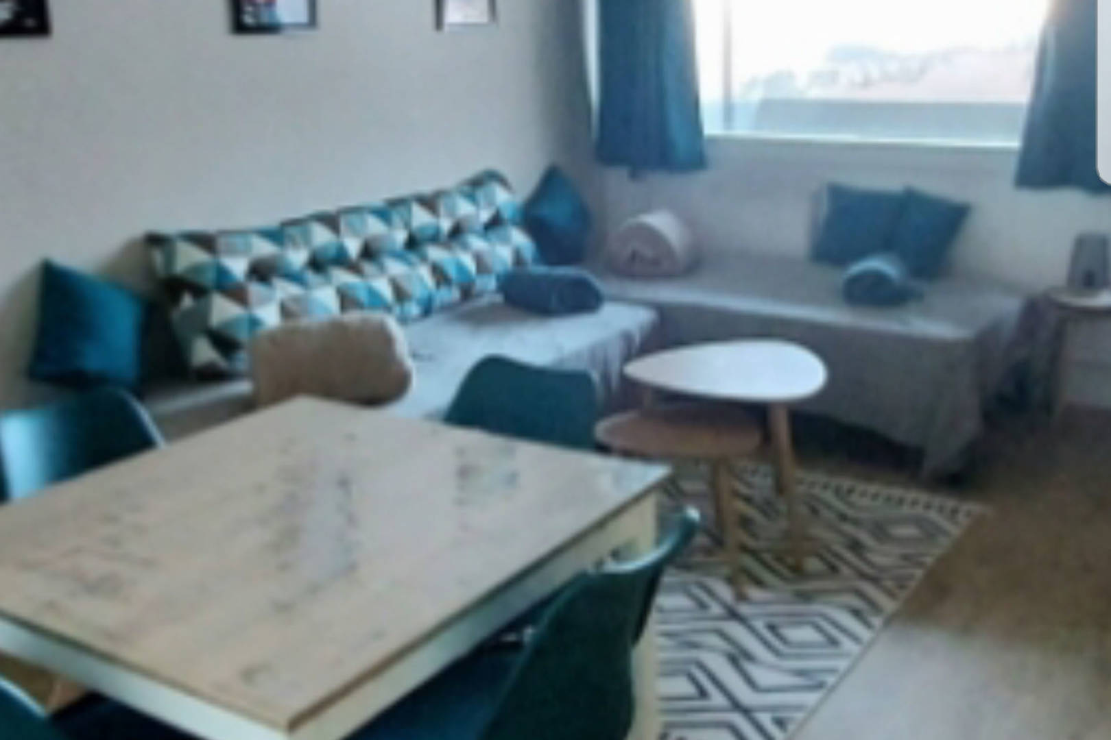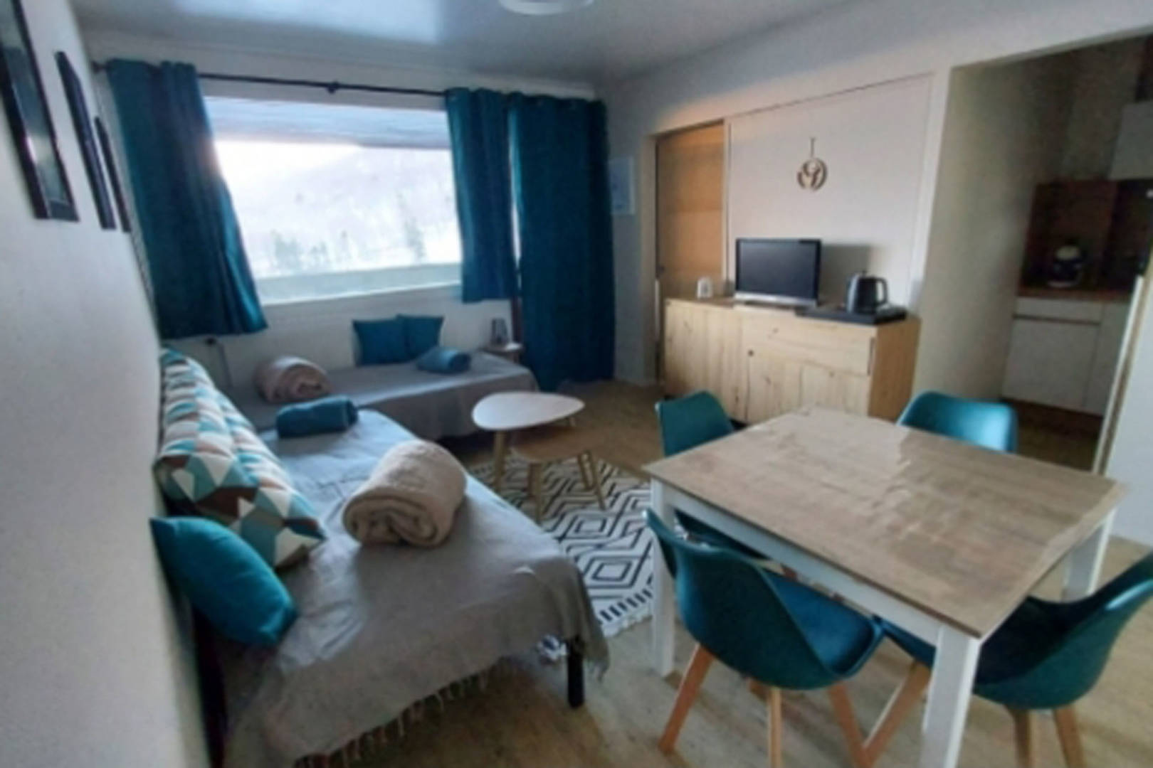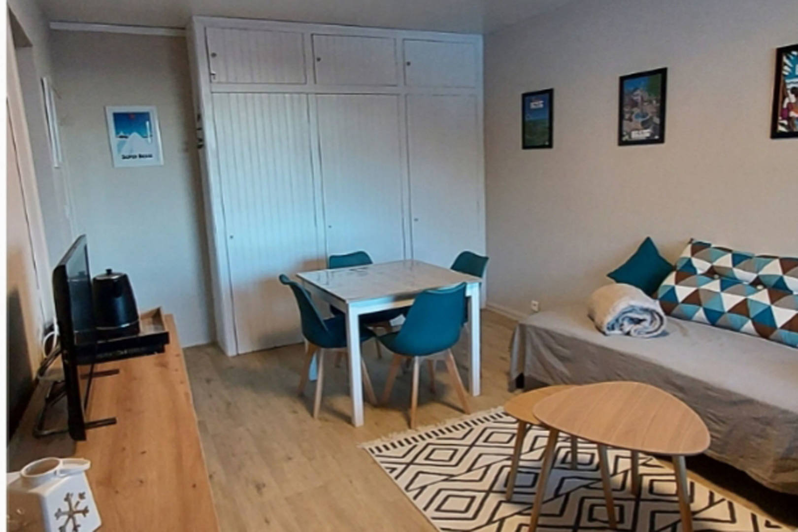 -Une pièce de vie avec 2 banquettes-lit (90X200), placards-rangements; accès au balcon.