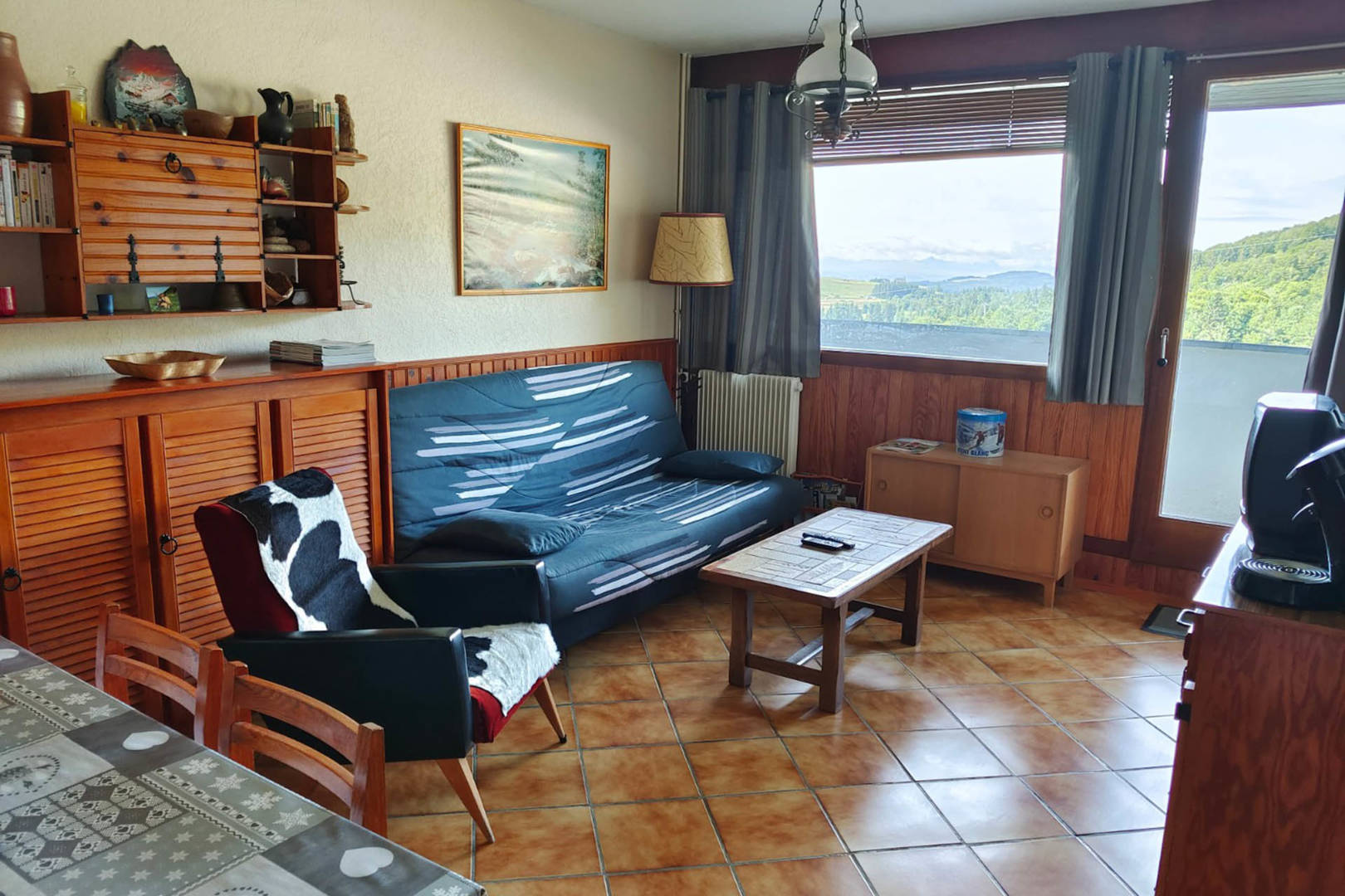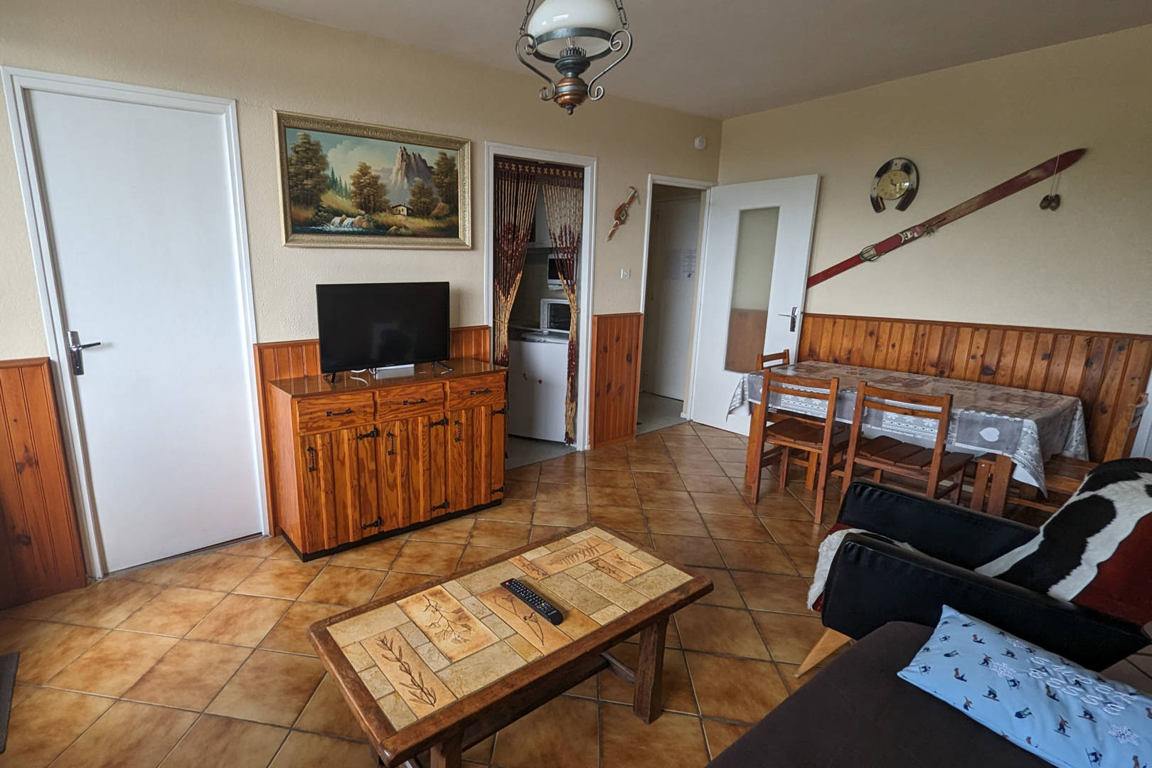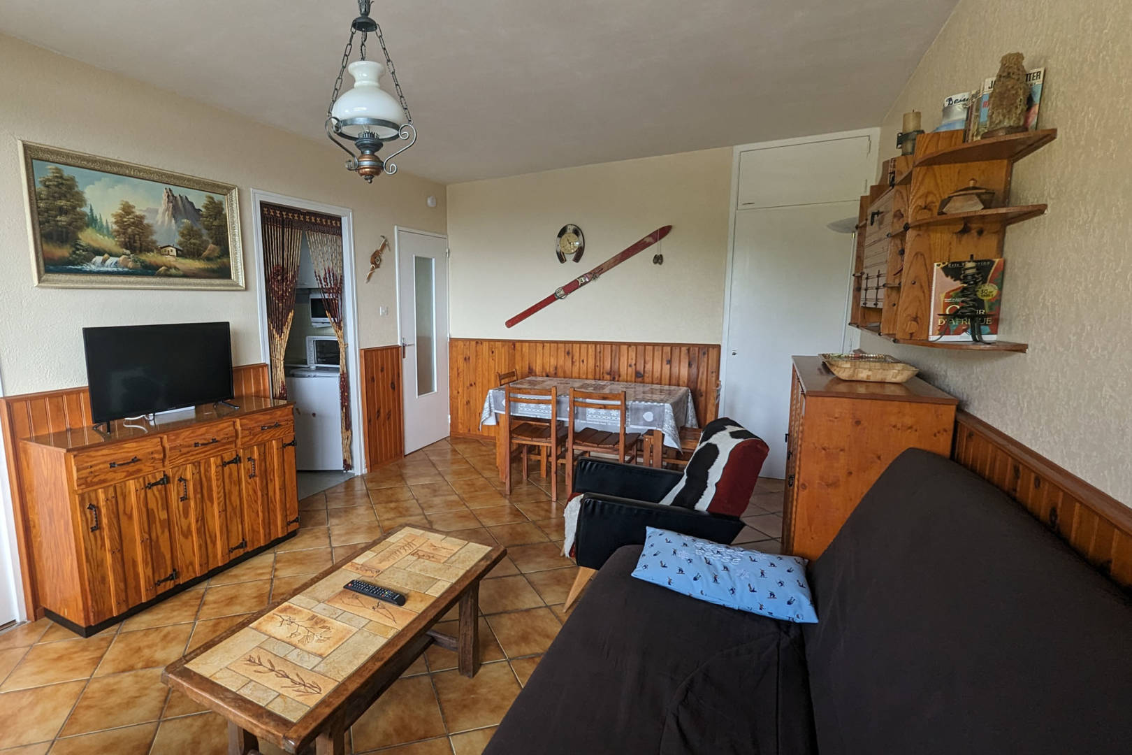 Salle de séjour avec coin repas, clic-clac (2 couchages), fauteuil, table basse, télévision.