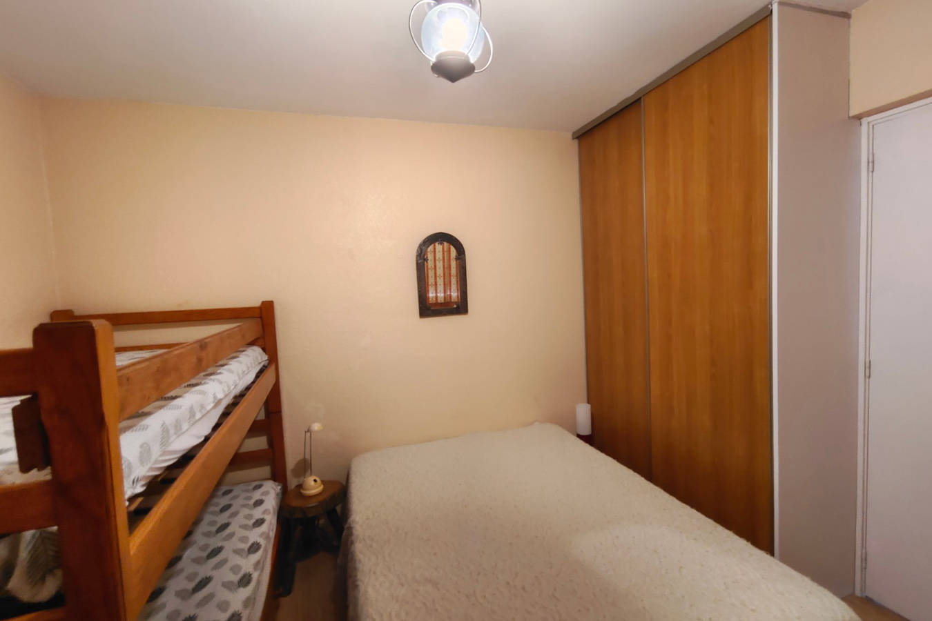 Chambre fermée avec lit double et 2 lits superposés, plus rangements. 4 couchages.