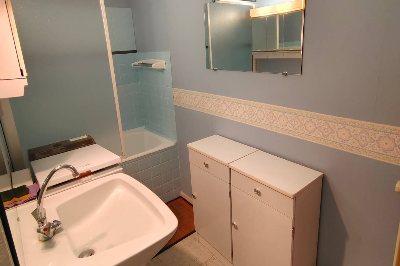 Salle de bains/WC avec baignoire, lavabo, lave-linge, placards.