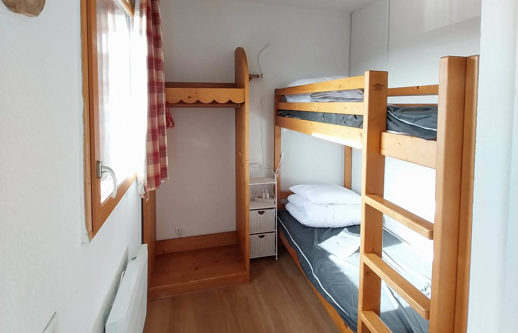 – un espace cabine fermé, par une porte coulissante, donnant sur le salon, avec lits superposés et une penderie. (Le lit en hauteur n’est pas adapté aux enfants de moins de 6 ans).
