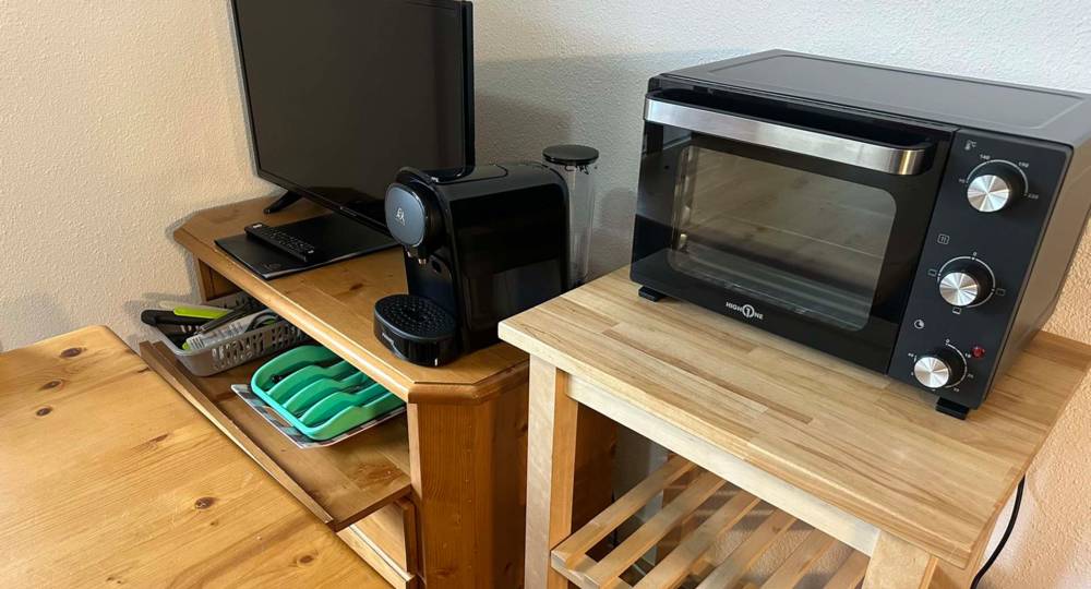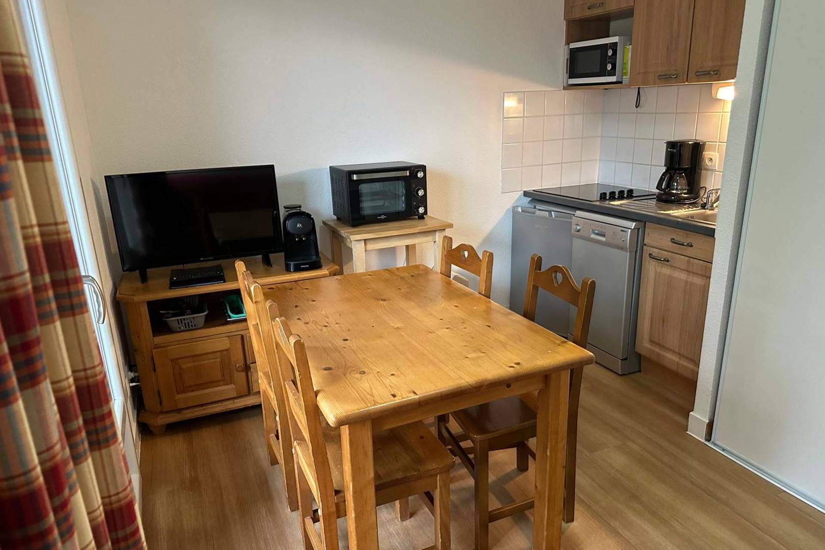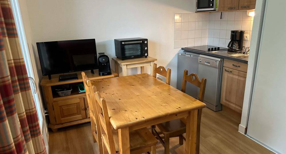 L’appartement est composé d’une entrée, d’une chambre avec lit double140*190, d’une salle de bain avec baignoire, d’un WC, d’un salon cuisine avec canapé BZ. Le logement est équipé de la télévision, d’un réfrigérateur, d’un micro-ondes, d’un lave vaisselle, d’une cafetière à filtre, d’une cafetière L’OR BARISTA (compatible dosettes Nespresso), d’une bouilloire, du nécessaire pour cuisiner et de la vaisselle pour 4 personnes, d’un aspirateur.