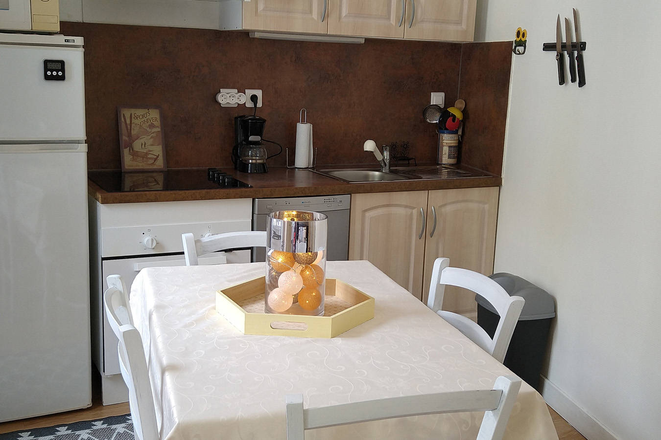 Appartement entièrement équipé comprenant : – un coin cuisine et repas avec plaques à induction, four multifonctions, réfrigérateur-congélateur, lave-vaisselle, micro-ondes, cafetière, bouilloire, grille-pain et service à raclette. – un coin séjour avec clic-clac deux personnes, TV. Mise à disposition gratuitement d’un lit bébé et d’une chaise bébé. – une(…)