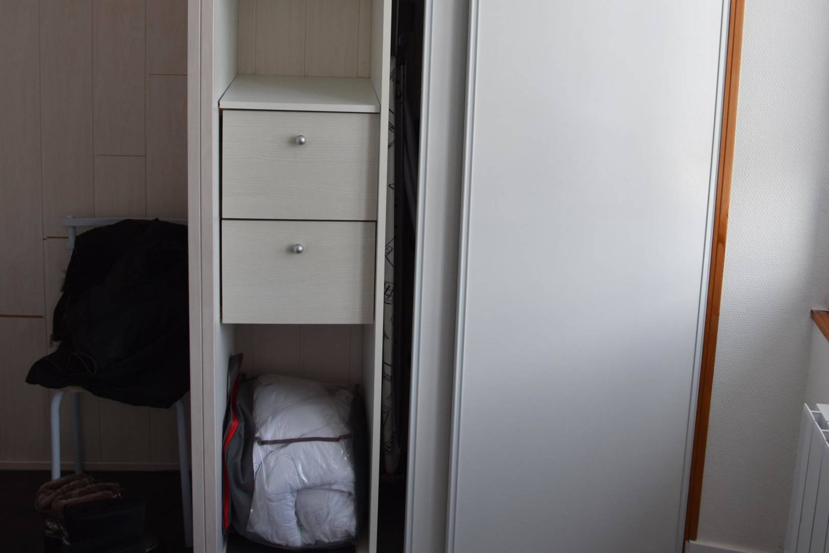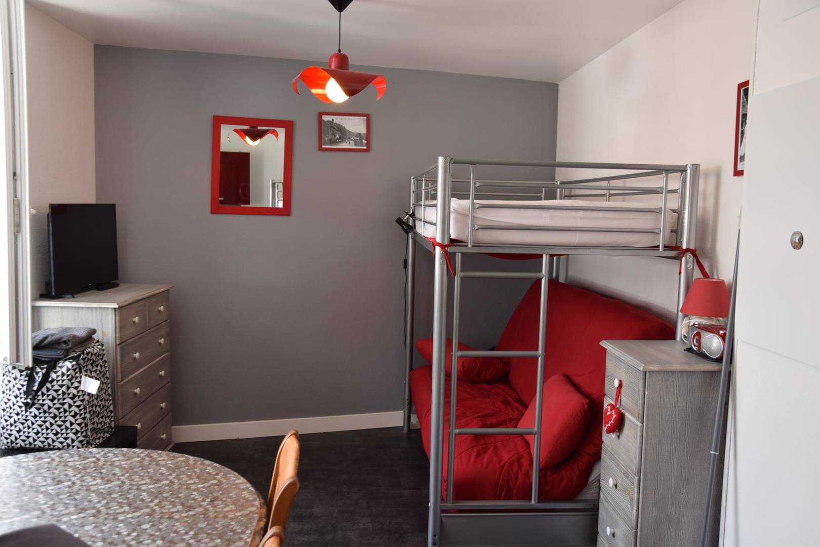 – Espace de vie : coin repas et séjour avec lit mezzanine de 90cm + clic-clac 140cm, commode, chiffonnier, TV écran plat 32″-81cm, radio (CD, USB).