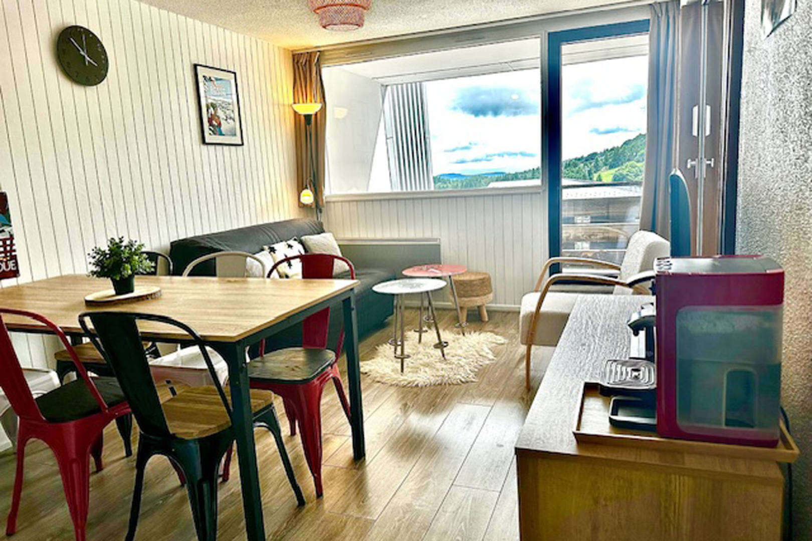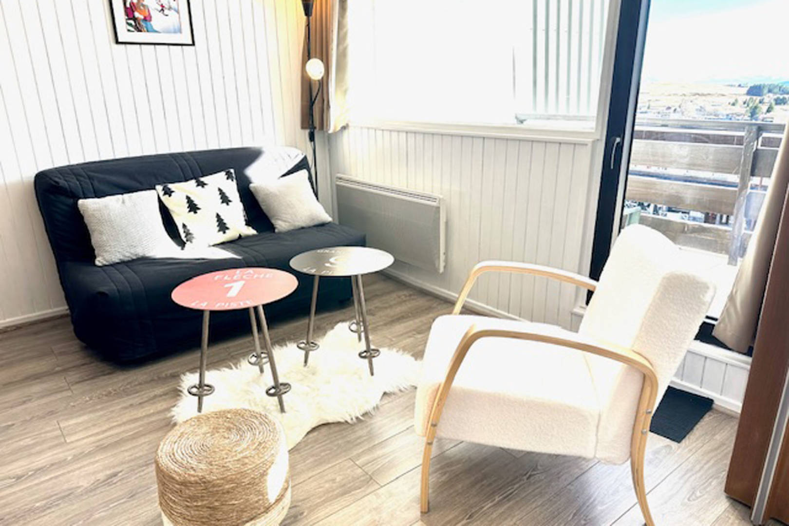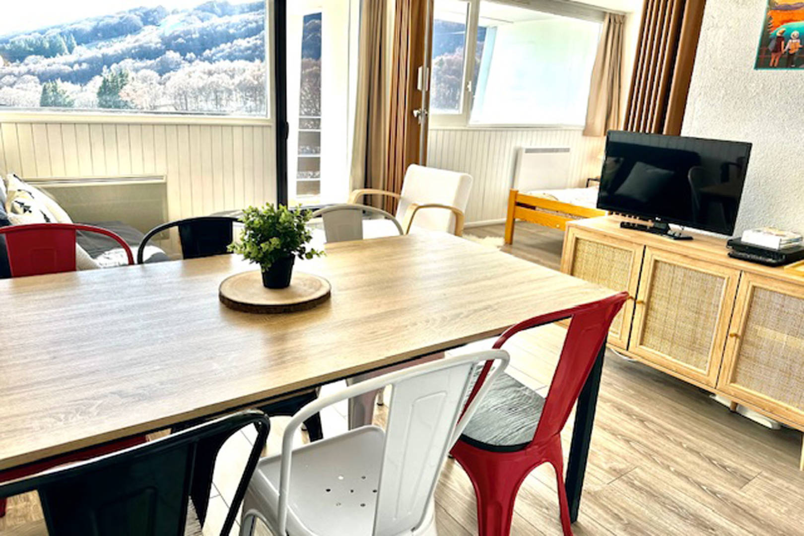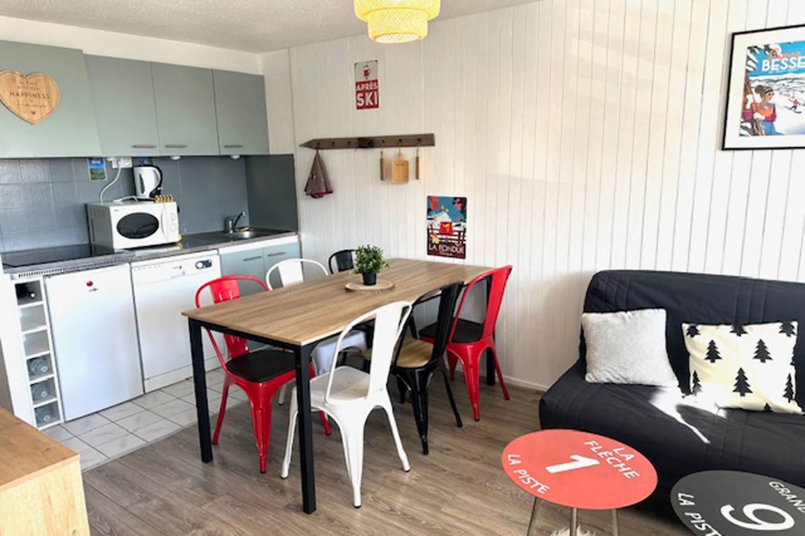 Agréable appartement de 40m2 avec grand balcon de 10m2 avec 1 chambre avec un lit 140×190 , 1 chambre cabine avec 2 lits 90×190, salon avec un Bz 140×190 donnant sur le balcon avec du mobilier extérieur, cuisine ouverte, salle de bain avec baignoire et machine à laver, un WC séparé et grand local à ski chauffé.