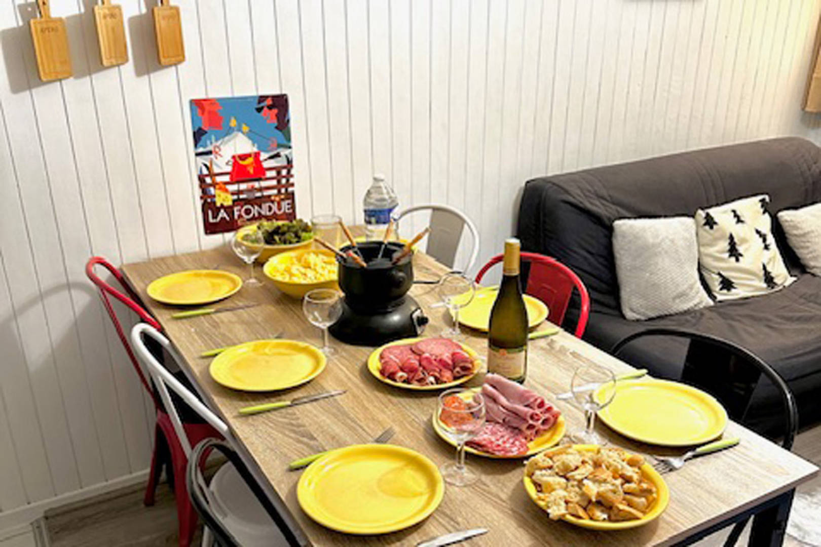 1 télévision, 1 lecteur DVD, appareil à raclette et à fondue, lave vaisselle, micro-ondes, bouilloire, grille-pain, cafetière à dosettes Senséo, lave-linge, aspirateur, couettes, couvertures et oreillers, jeux de société, mobilier extérieur: table, chaises et 2 transats.