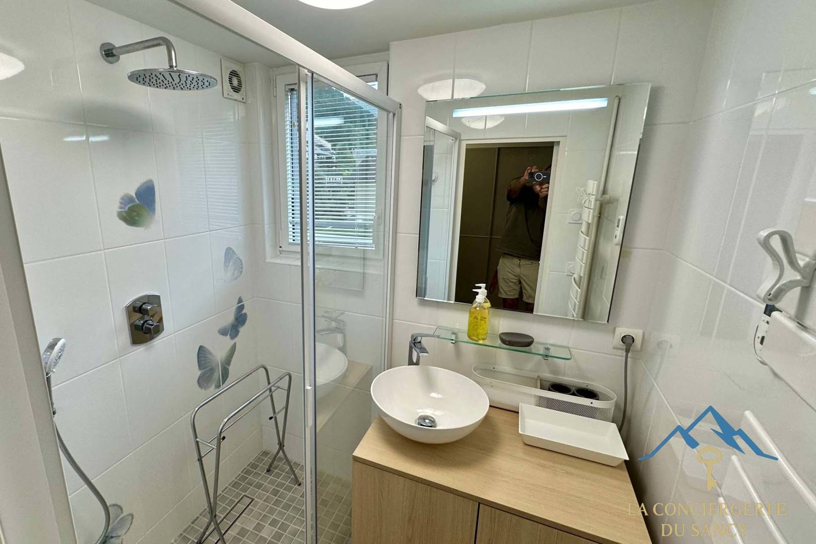 La salle de bain est équipée d’une douche, idéale pour se détendre après une journée d’activités.