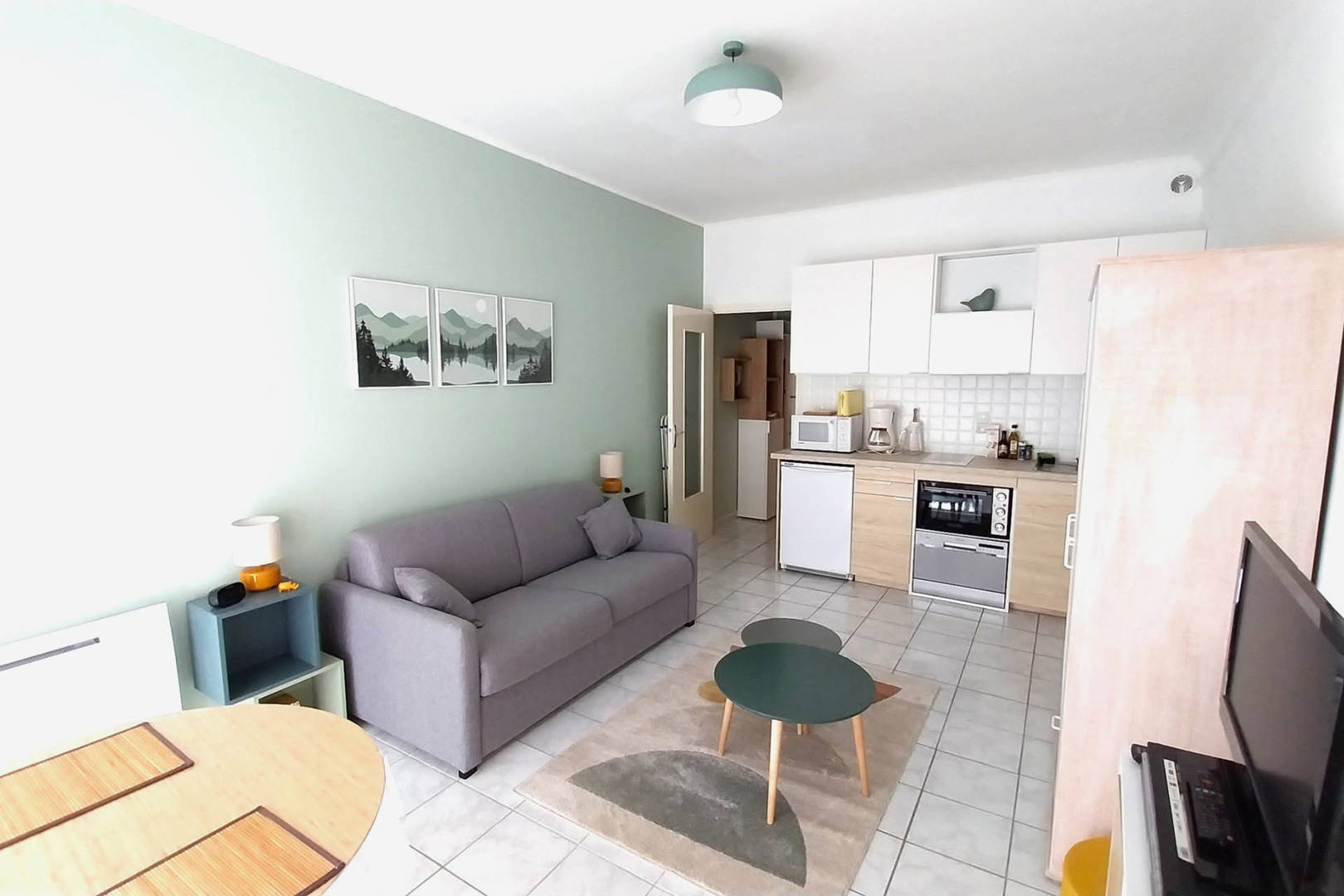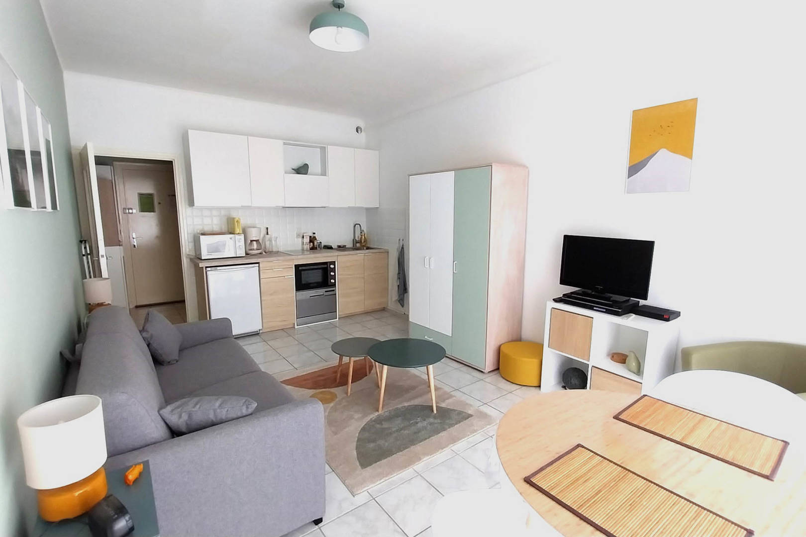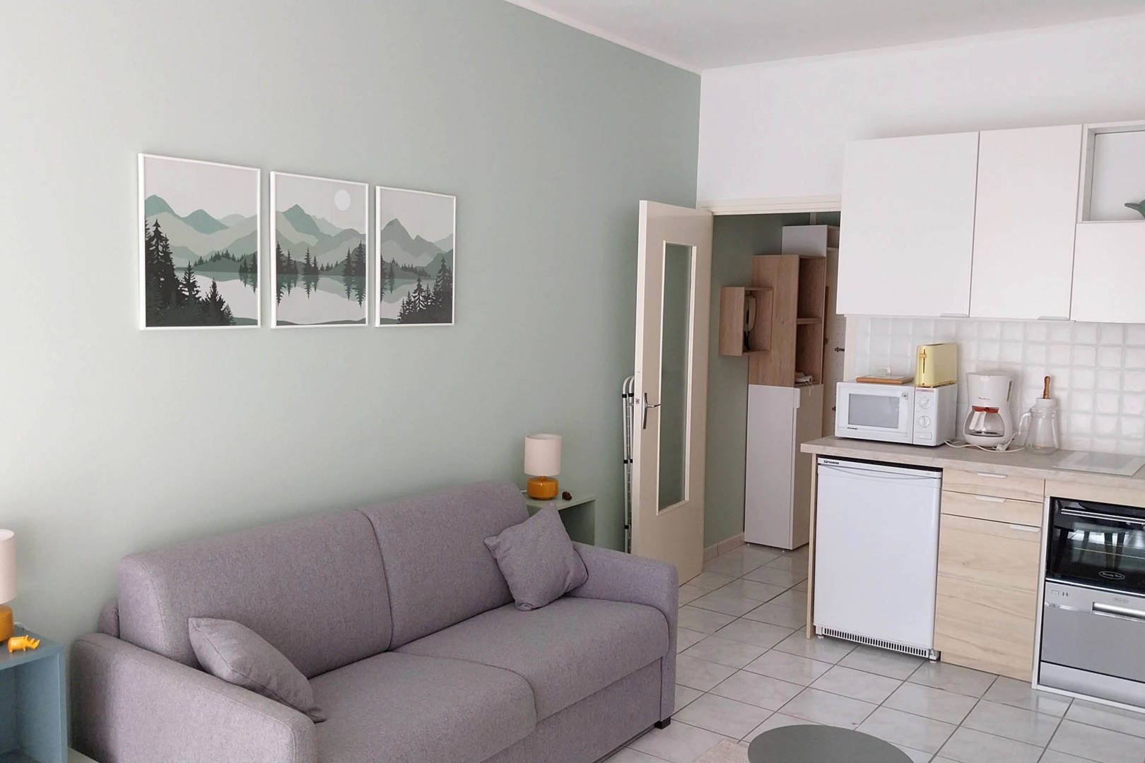 L’appartement, rénové, se compose d’une entrée avec rangements, d’une pièce de vie avec cuisine ouverte et un canapé lit de qualité (matelas 140 X 190 cm densité 40 kg/m3, sommier à doubles lattes larges), d’une armoire de rangement, d’un coin repas avec une table et deux chaises, un fauteuil et d’une salle d’eau avec douche, meuble vasque, WC et sèche serviette.