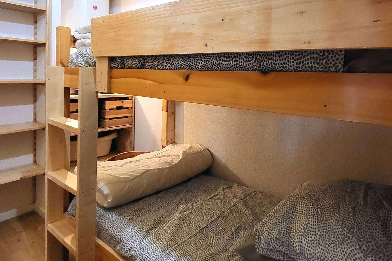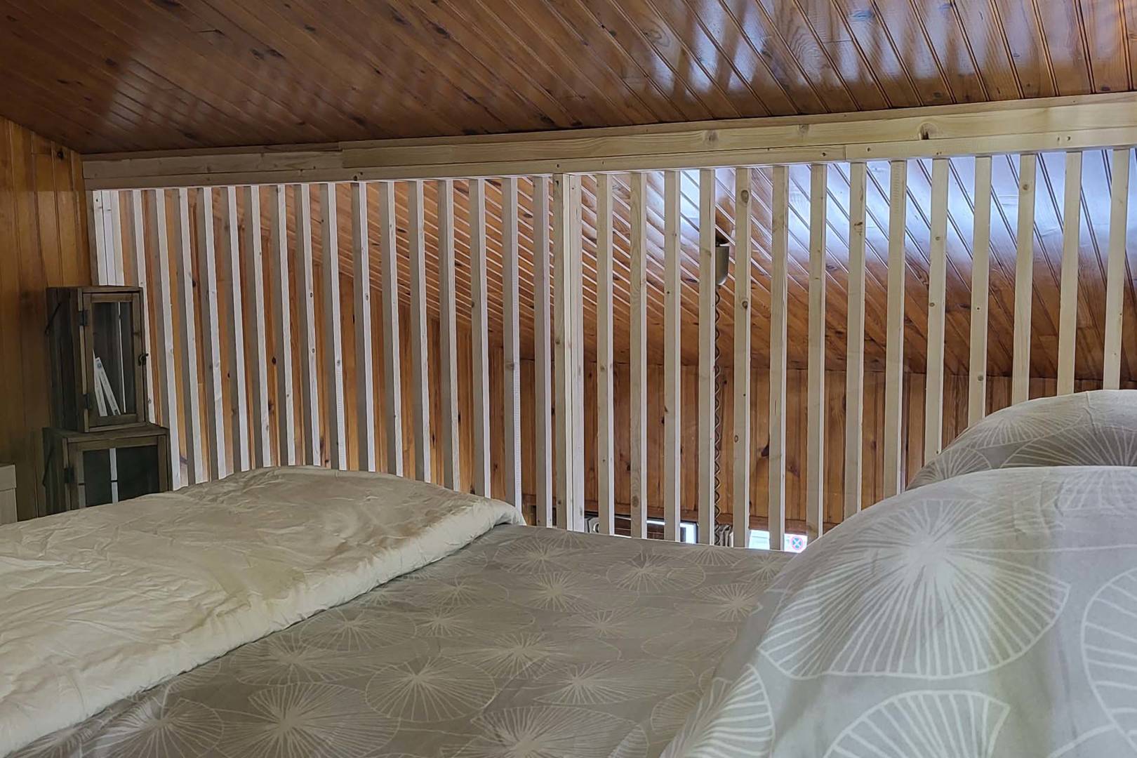 En haut, vous trouverez 2 espaces nuit séparés: 1 chambre adulte entiérement fermée et 1 chambre enfant traversante.