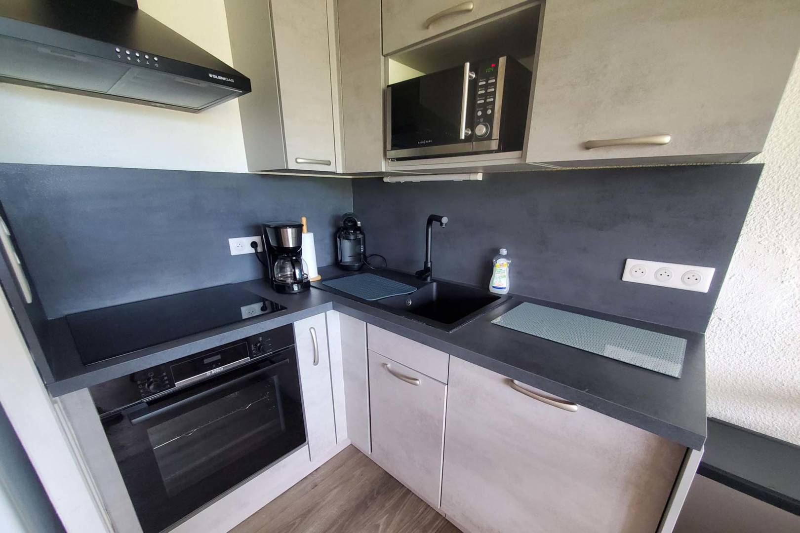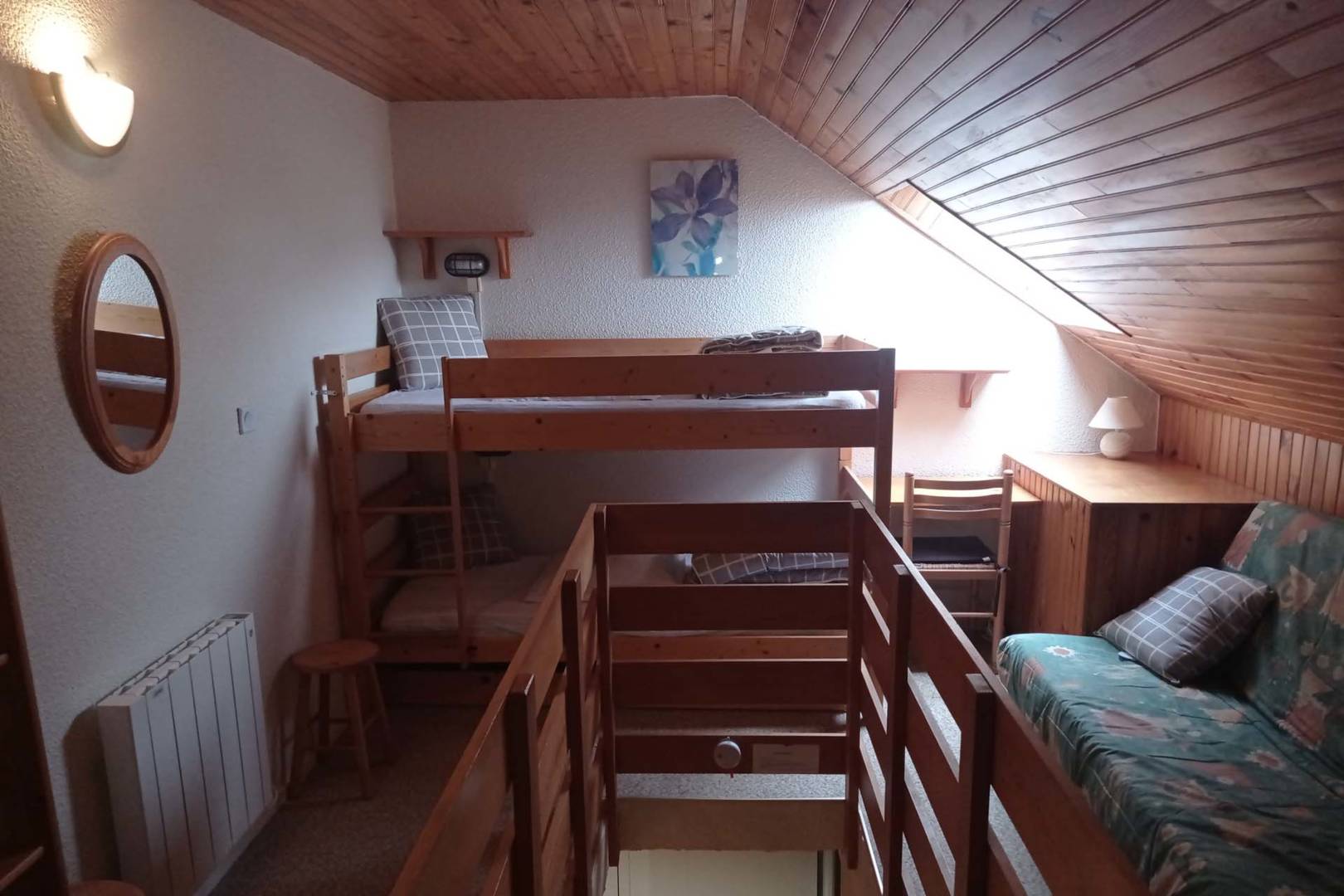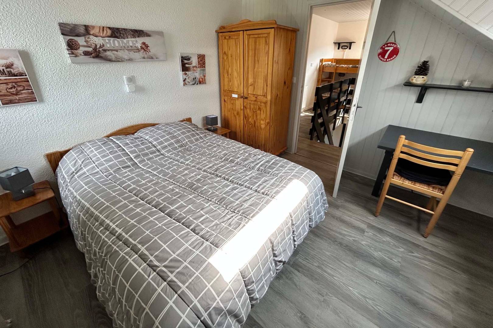 Il se compose comme suit : une entrée avec penderie, une salle de bain avec wc séparés, une kitchenette -séjour donnant sur le balcon avec la vue sur le Sancy et le Lac des Hermines puis un escalier donnant accès à l’étage ou il y a un « dortoir » puis une chambre.