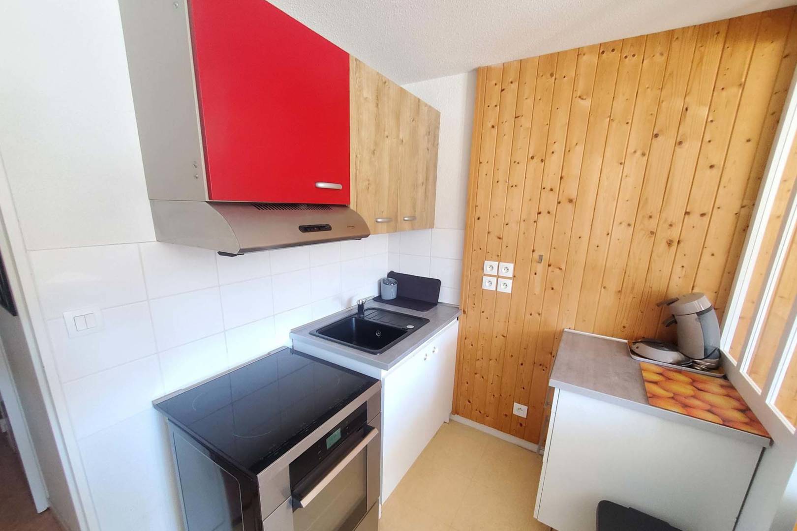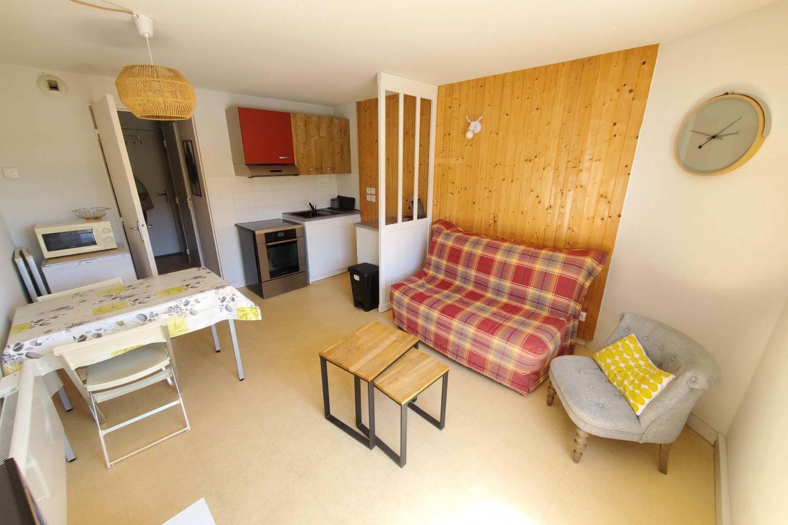 Une entrée avec un coin cabine avec deux lits superposés, une salle d’eau, puis séparé par une porte, une pièce de vie avec cuisine américaine.