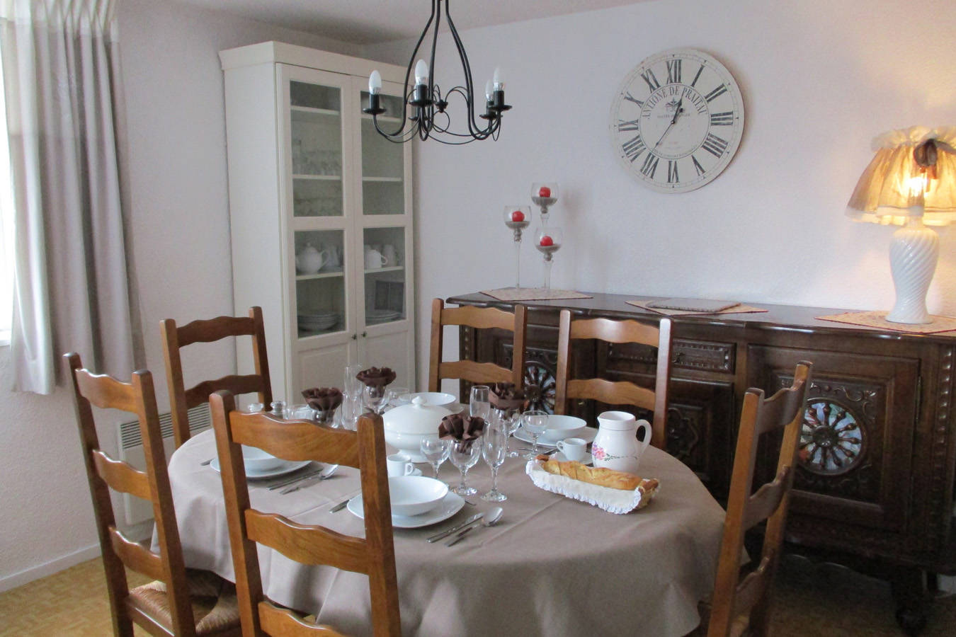 Séjour-salon avec canapé 3 places, 2 fauteuils, TV écran plat 80 cm et lecteur DVD (avec DVD tout public à disposition). Une grande table ovale avec 6 chaises, meuble de séjour avec toute la vaisselle nécessaire pour votre séjour.
