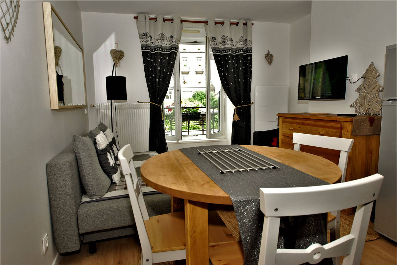 Une fenêtre exposée est avec vue sur les Thermes sur fond de forêt. Un canapé convertible.