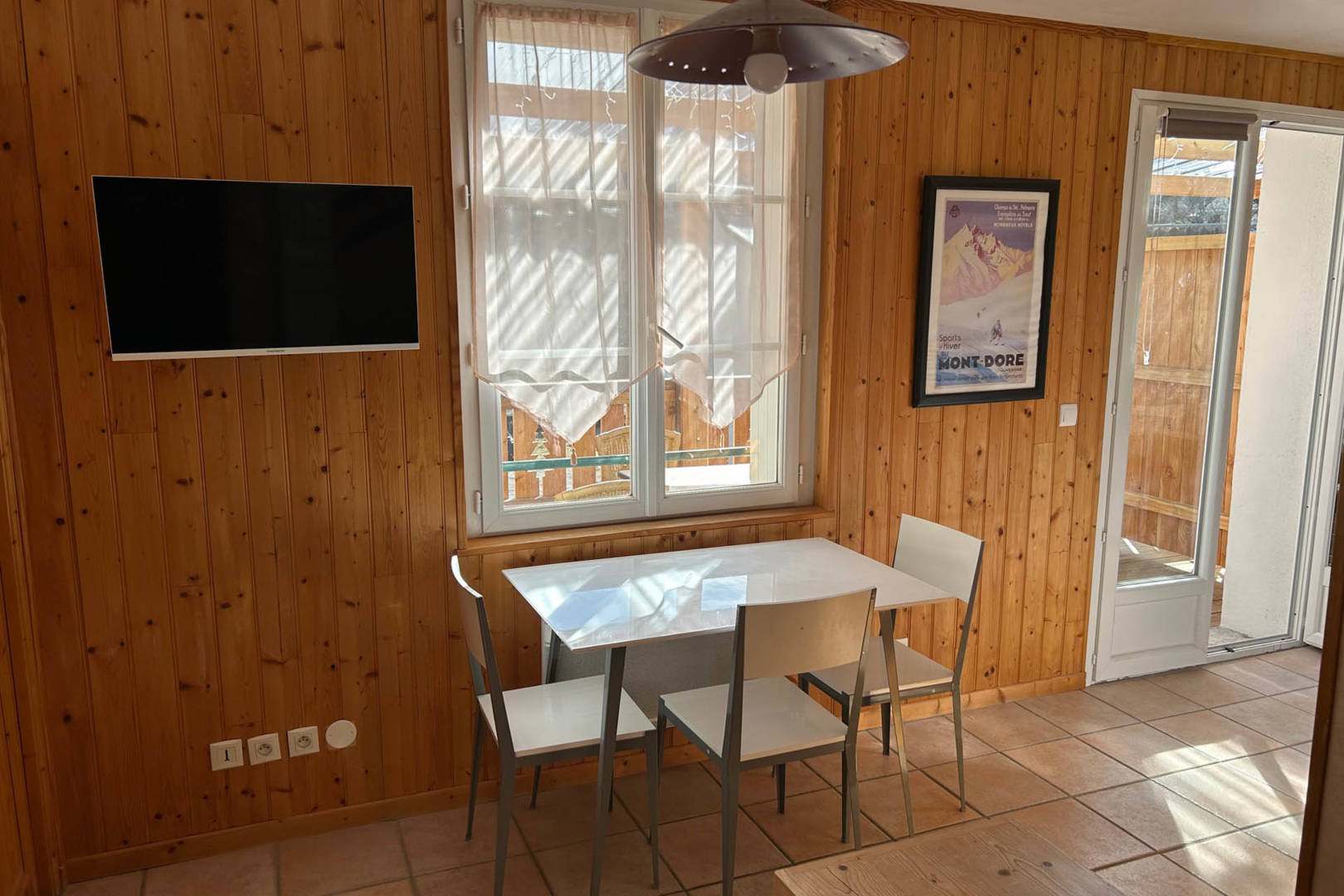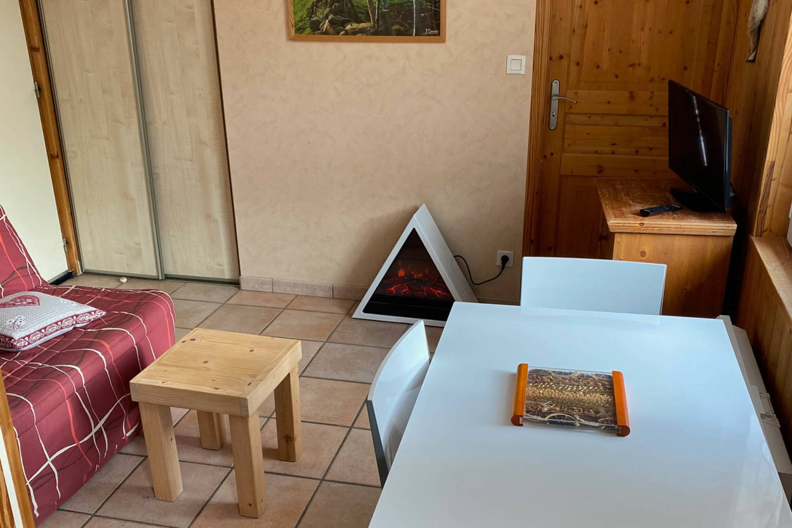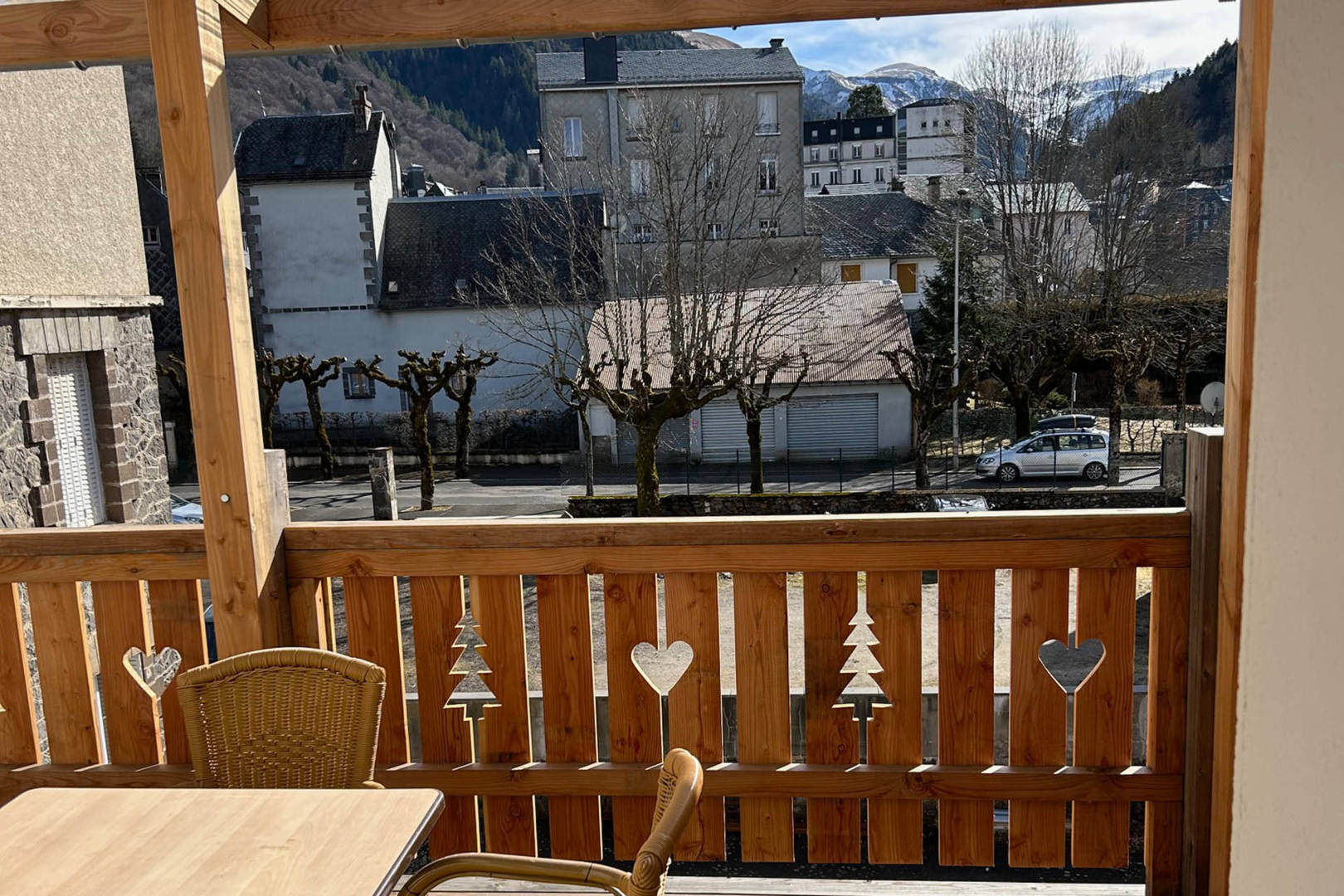 Joli F2 de 30 m² au 1er étage surélevé avec une chambre (lit de 140) et un séjour-cuisine avec un canapé BZ convertible, exposition sud-est avec vue sur le Sancy.