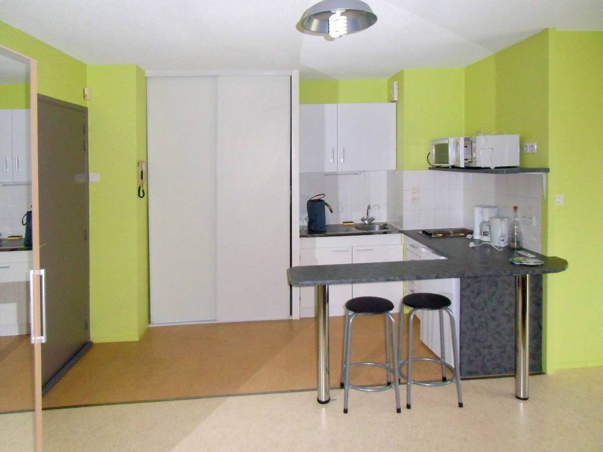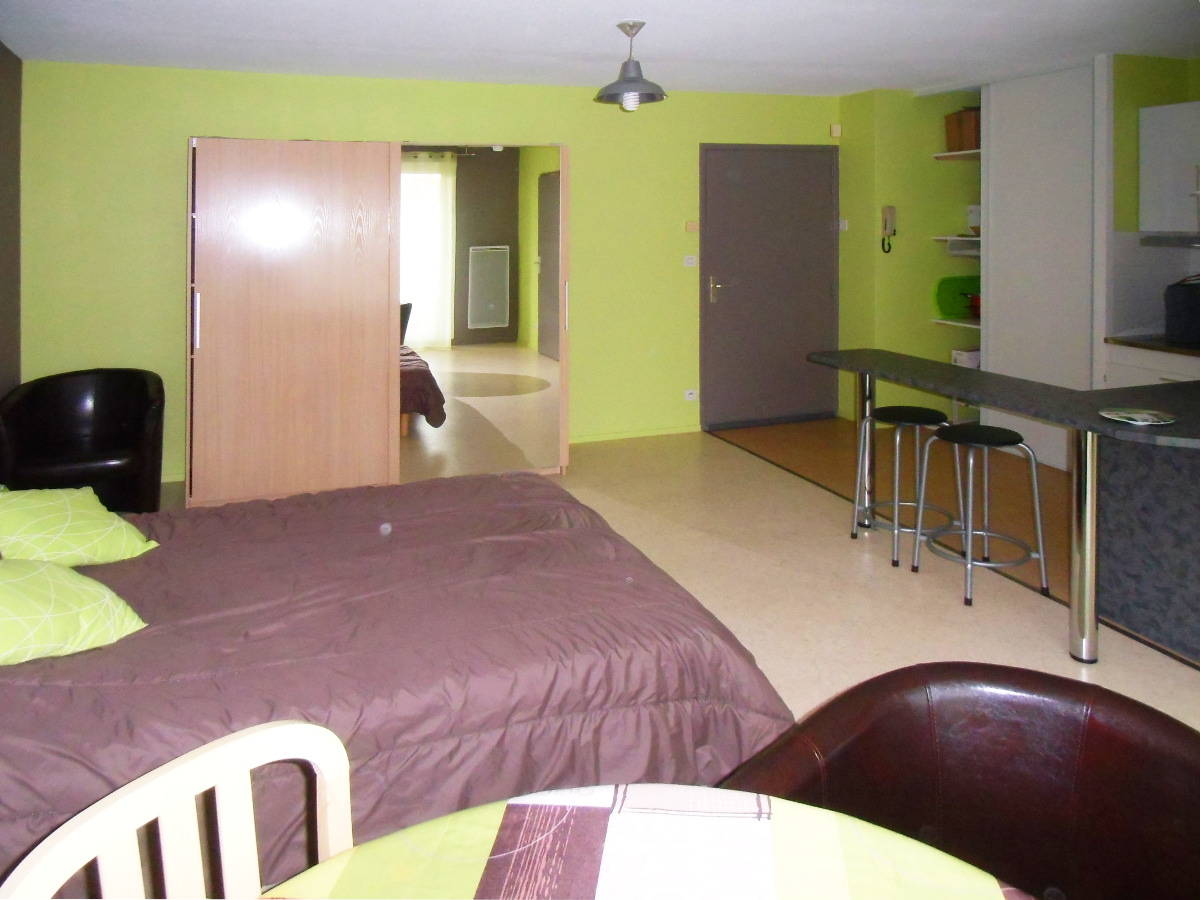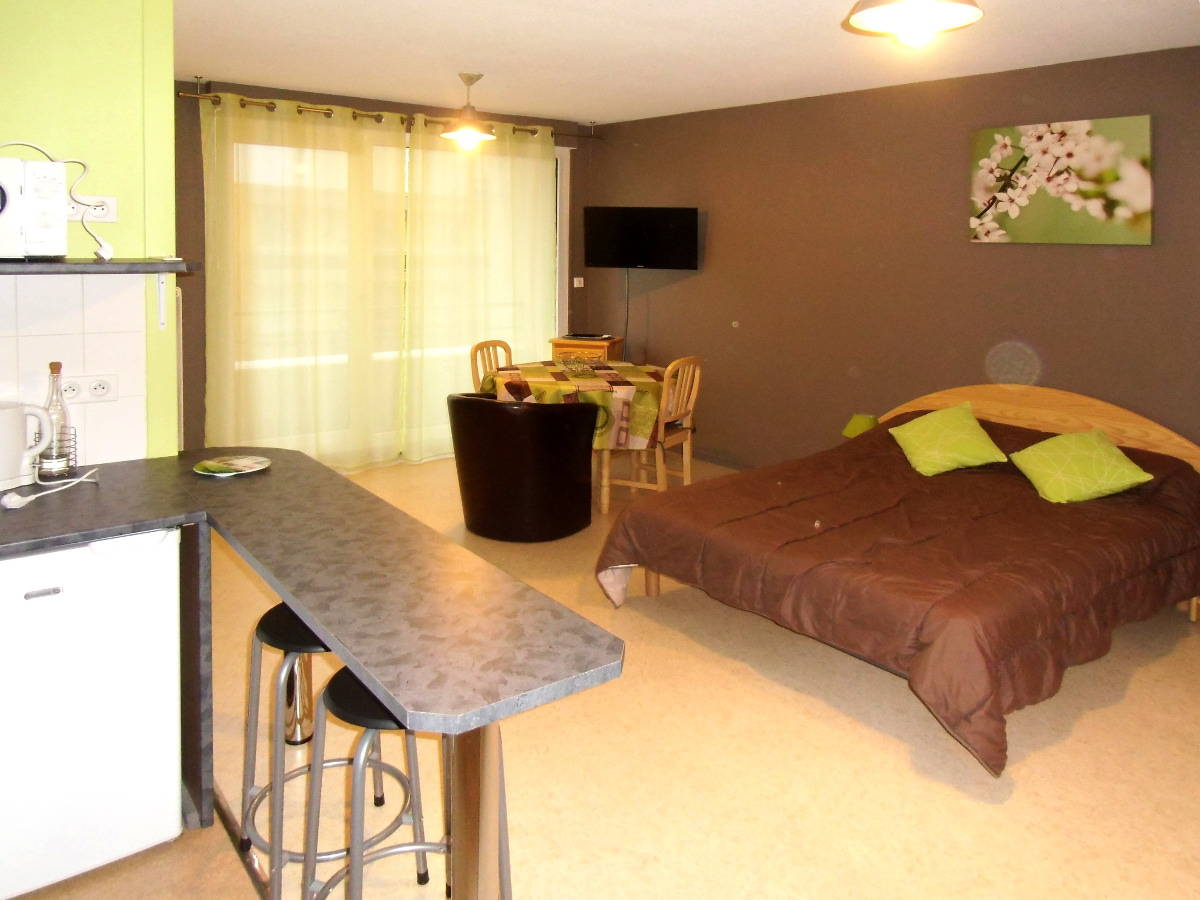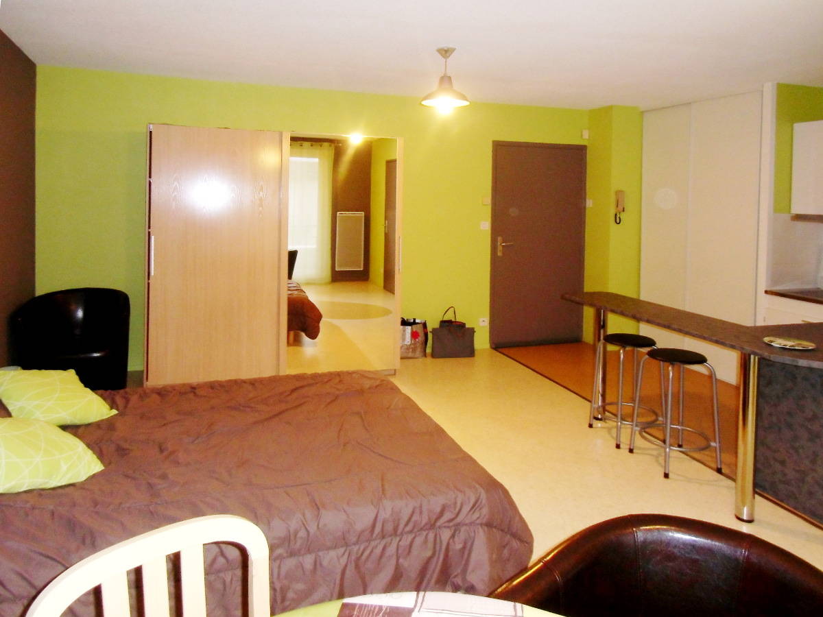 Espace chambre avec lit 140. Coin cuisine entièrement équipé. Salle d’eau avec WC. Proche de tous commerces et services. Bus et navette thermale à proximité. 500 mètres à pied des thermes. Parc privé à la résidence et à proximité du Parc Bargoin.