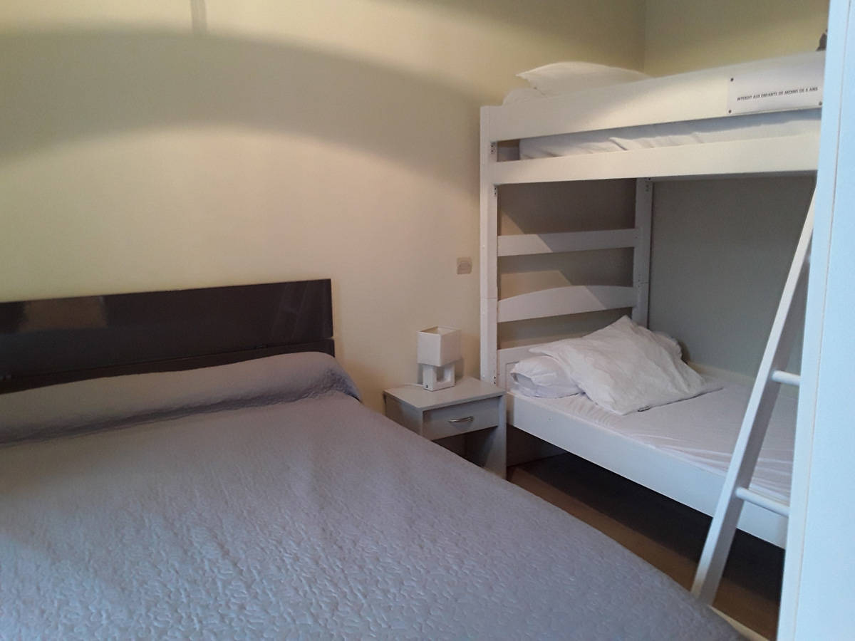 1 chambre avec 1 lit de 140, 2 lits de 90 superposés, salon avec clic-clac (espace couchage par rideaux occultants). Salle de bain, WC, local à ski.