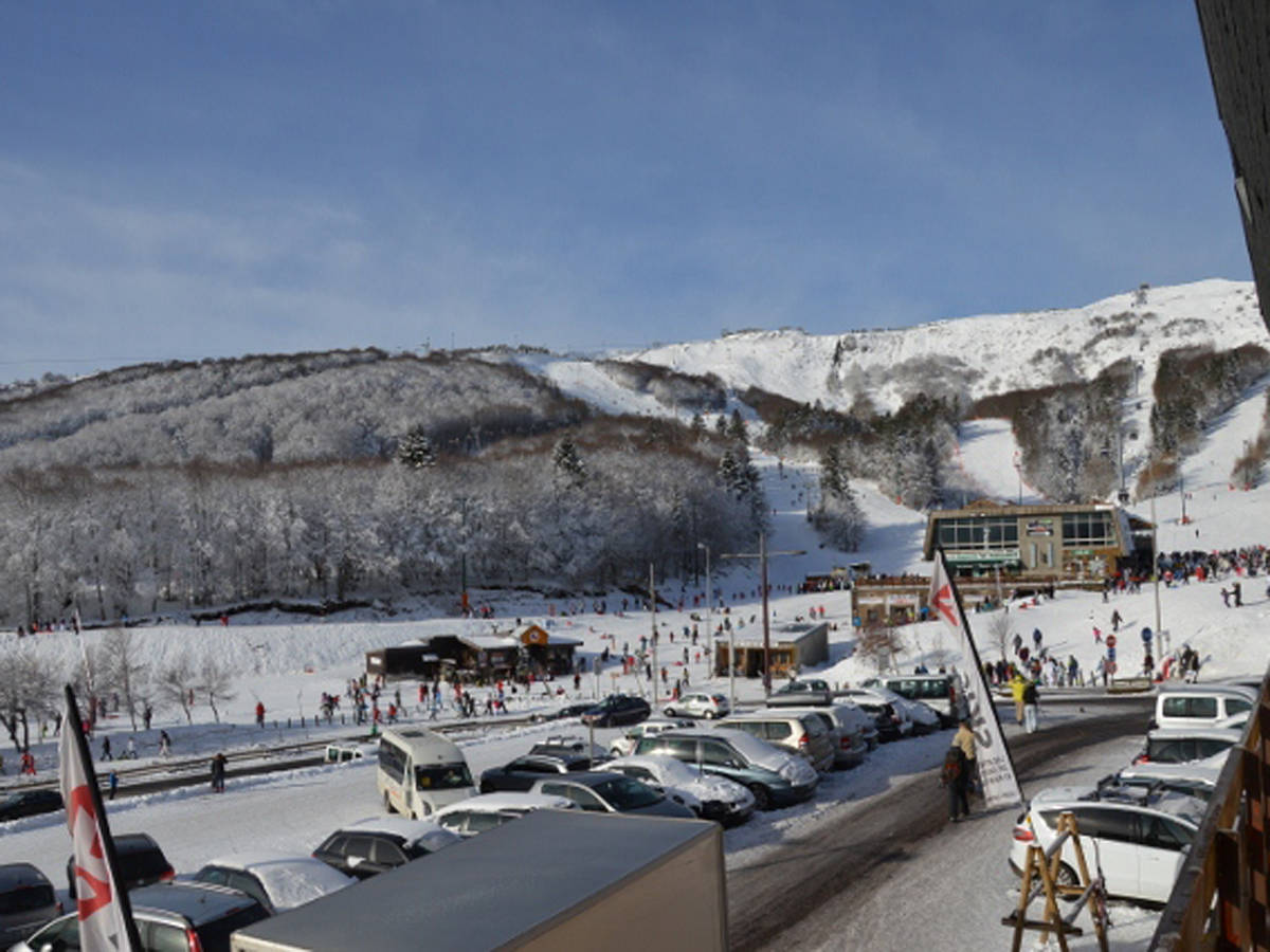 Terrasse de 5m² avec chaises et tables pliantes, vue sur le coeur de la station et une partie des pistes.