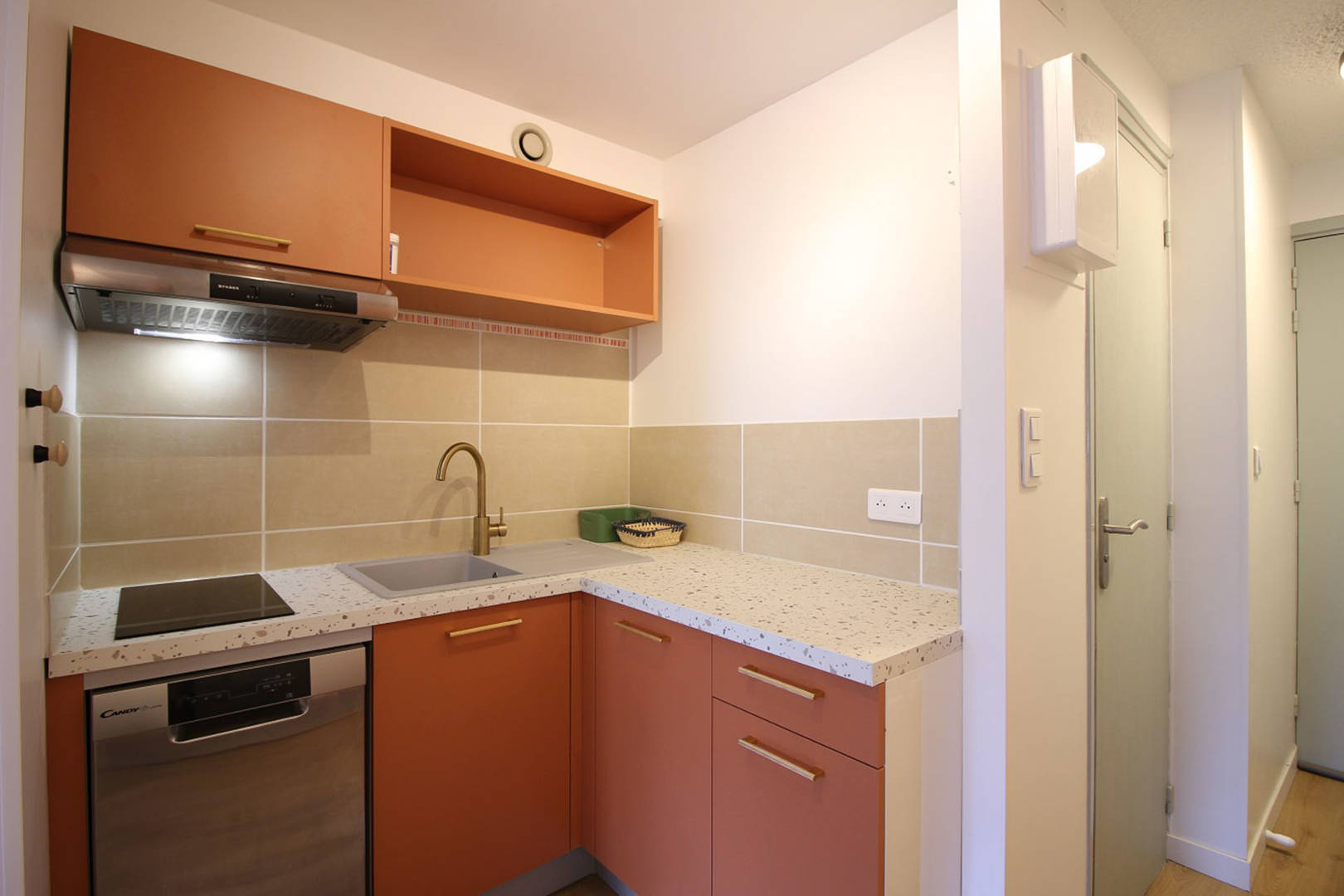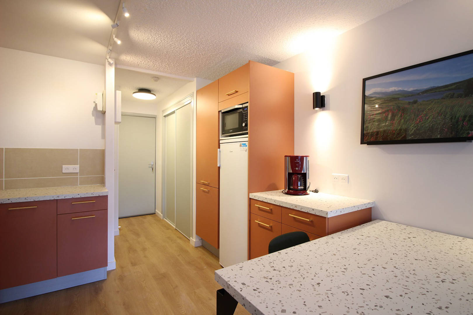 Cet appartement est composé d’une entrée avec rangements, cuisine US équipée avec plaque induction 2 feux, hotte, four multi-fonctions, micro-ondes, réfrigérateur grand modèle + congélateur, lave-vaisselle.