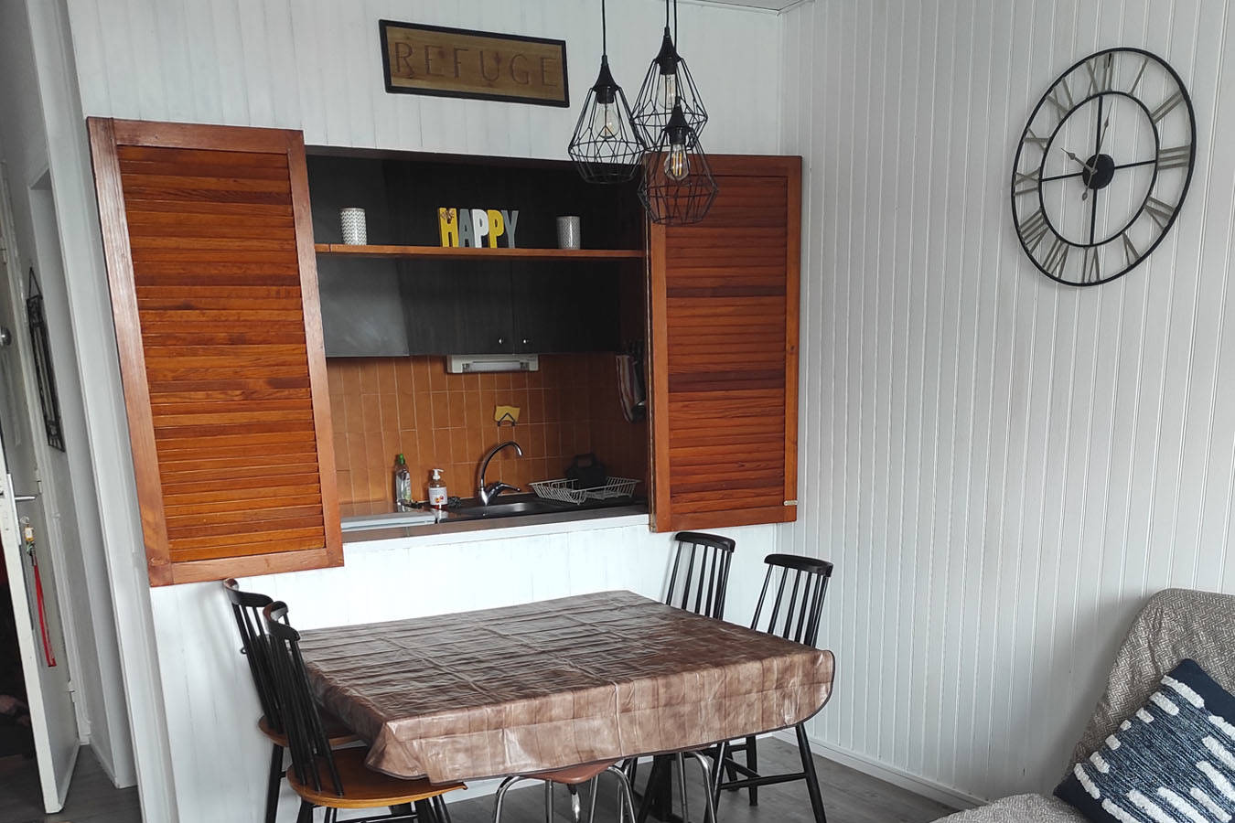 Très chaleureux, il se compose : -d’une entrée -d’une cuisine (appareil à raclette, four, plaque de cuisson, appareil à fondue, grille pain, barbecue électrique…) -d’un séjour avec TV, clic-clac -d’une chambre avec lits doubles superposés -d’une salle de bain avec une vasque et baignoire sabot, -d’un wc séparé.
