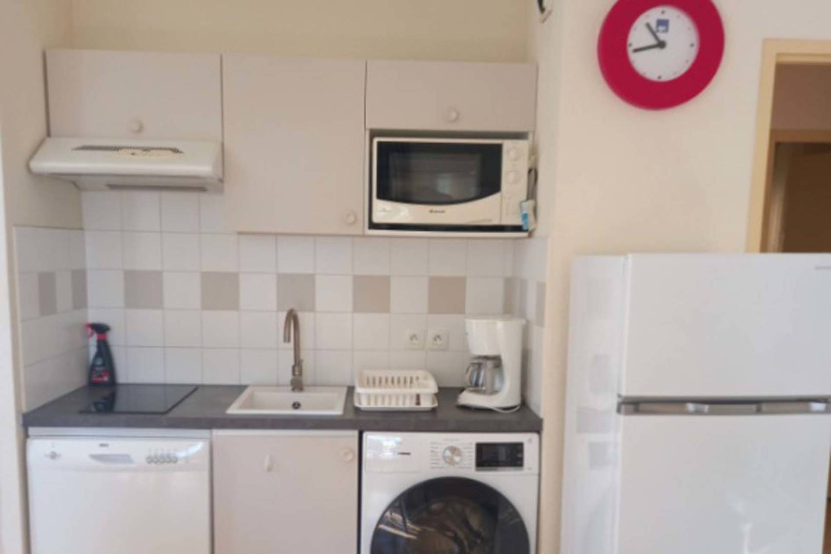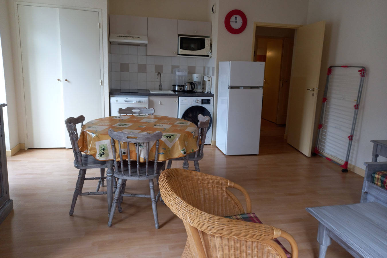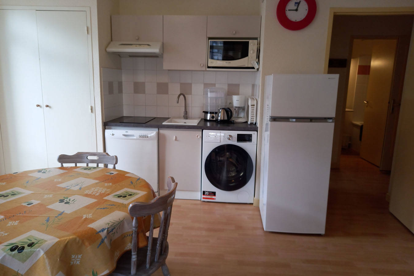 Beau 2 pièces en angle orientation sud-est, 4 personnes, très lumineux, une pièce à vivre avec cuisine aménagée (lave vaisselle, lave linge, réfrigérateur-congélateur, micro-ondes, cuit vapeur, plaque à induction, four, desserte).
