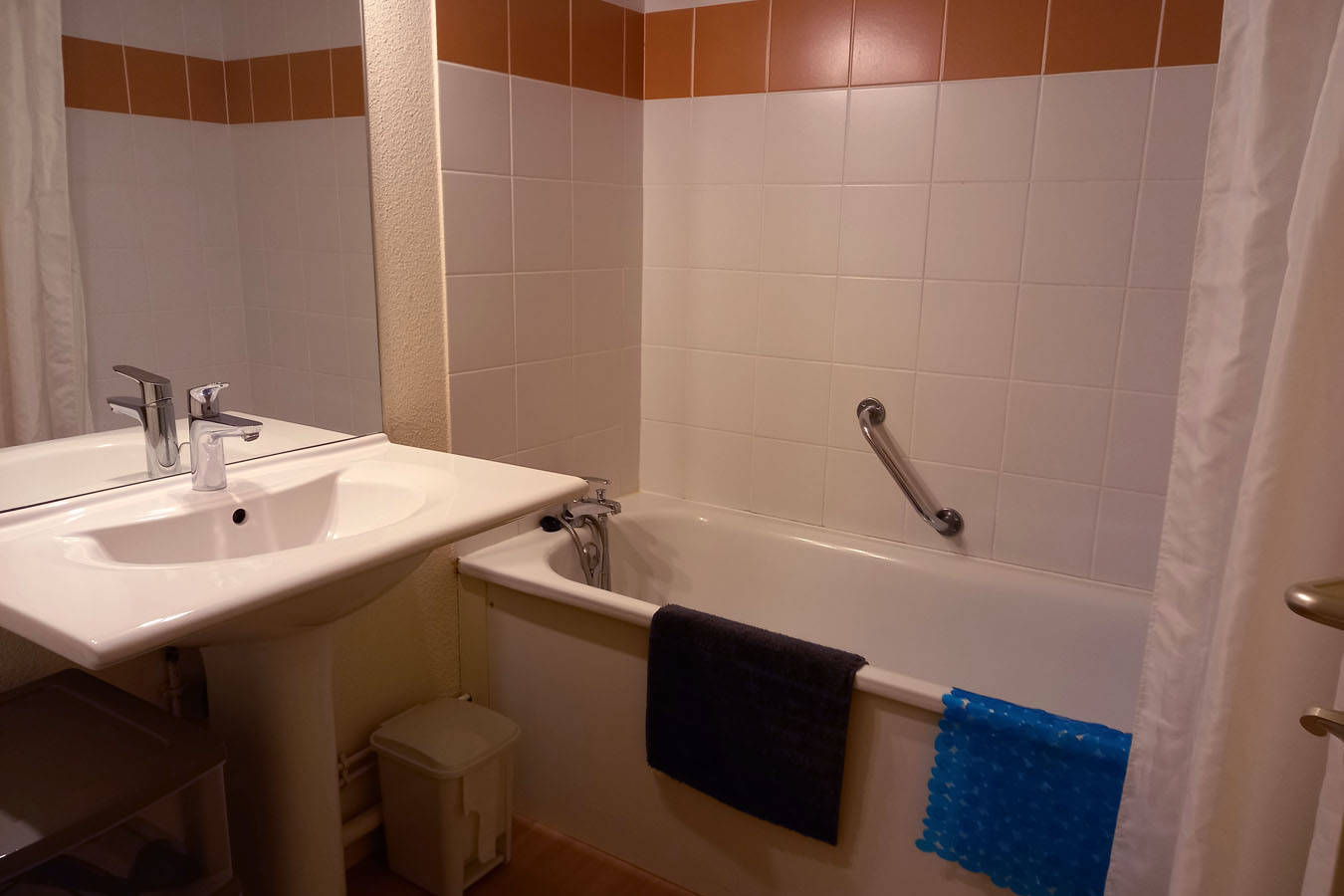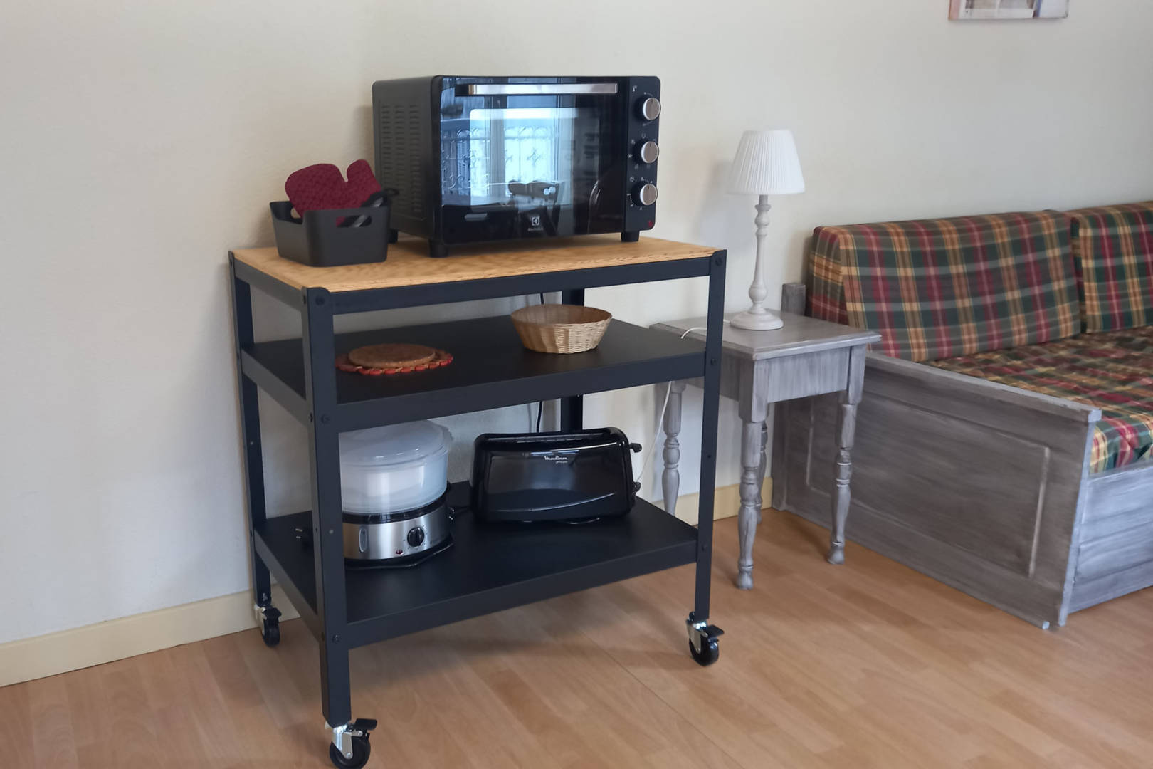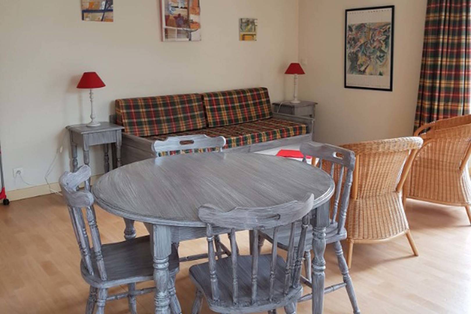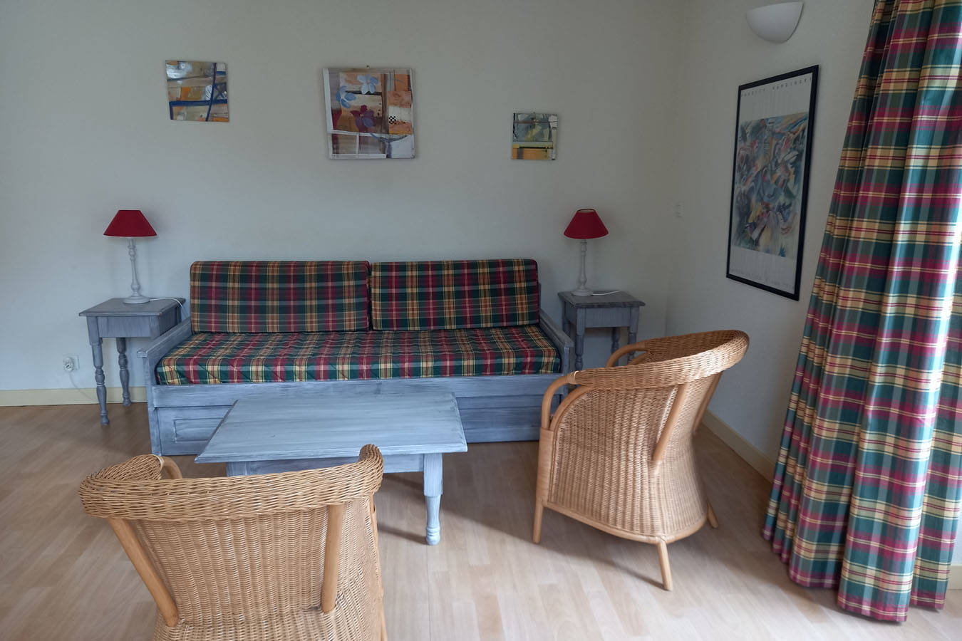 Beau 2 pièces en angle orientation sud-est, 4 personnes, très lumineux, une pièce à vivre avec cuisine aménagée (lave vaisselle, lave linge, réfrigérateur-congélateur, micro-ondes, cuit vapeur, plaque à induction, four, desserte).