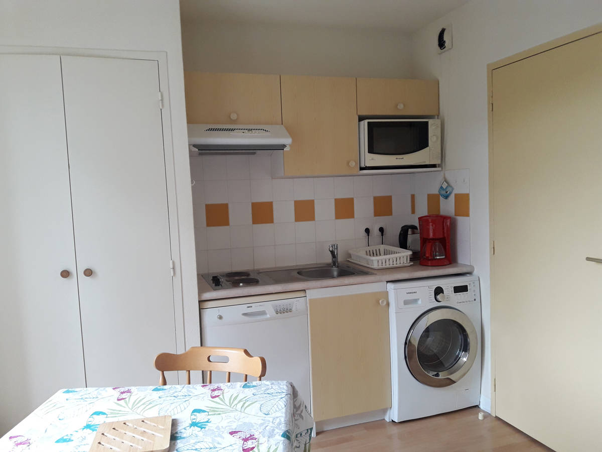 Lit 2 places, coin cuisine, lave-linge séchant, salle de bain avec WC et sèche cheveux.
