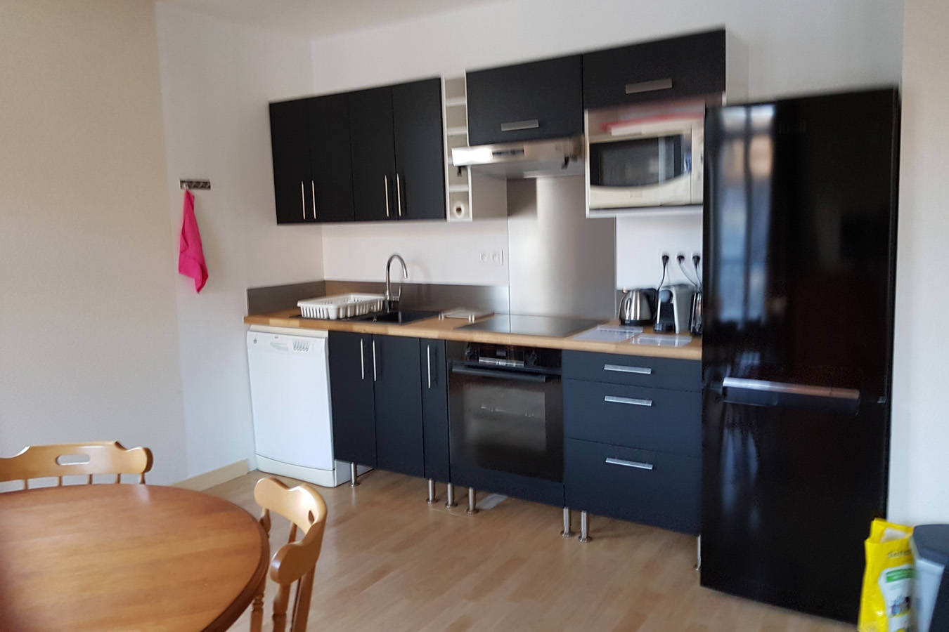 Cuisine avec plaques à induction, four, réfrigérateur, congélateur, lave-vaisselle.