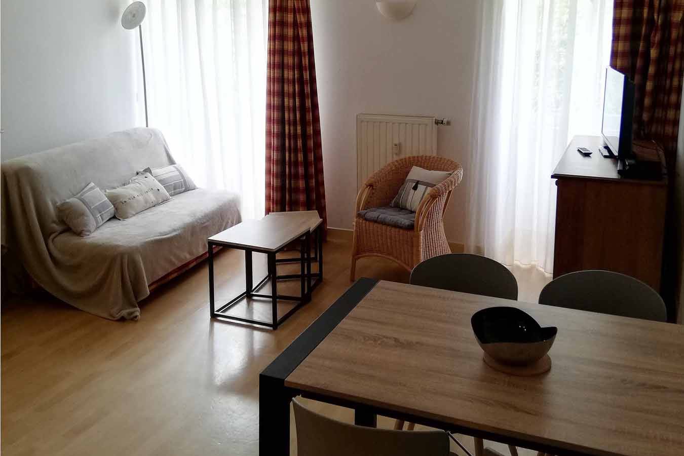 L’appartement dispose d’une pièce à vivre spacieuse, avec canapé, fauteuil, téléviseur et lecteur DVD.