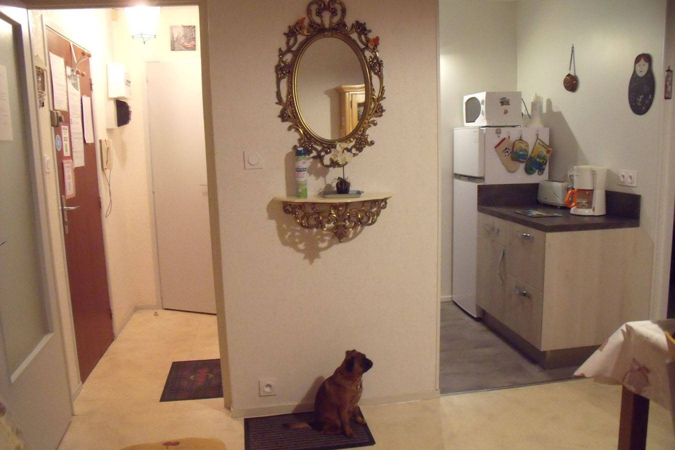 Cet appartement pouvant accueillir quatre à cinq personnes se compose comme suit : – une entrée avec grand placard, penderie et nécessaire pour le ménage, produits d’entretien, désinfectants… – une cuisine entièrement réaménagée et équipée à neuf, ouverte sur le séjour, cuisinière électrique quatre plaques avec four, hotte aspirante, micro-ondes,(…)