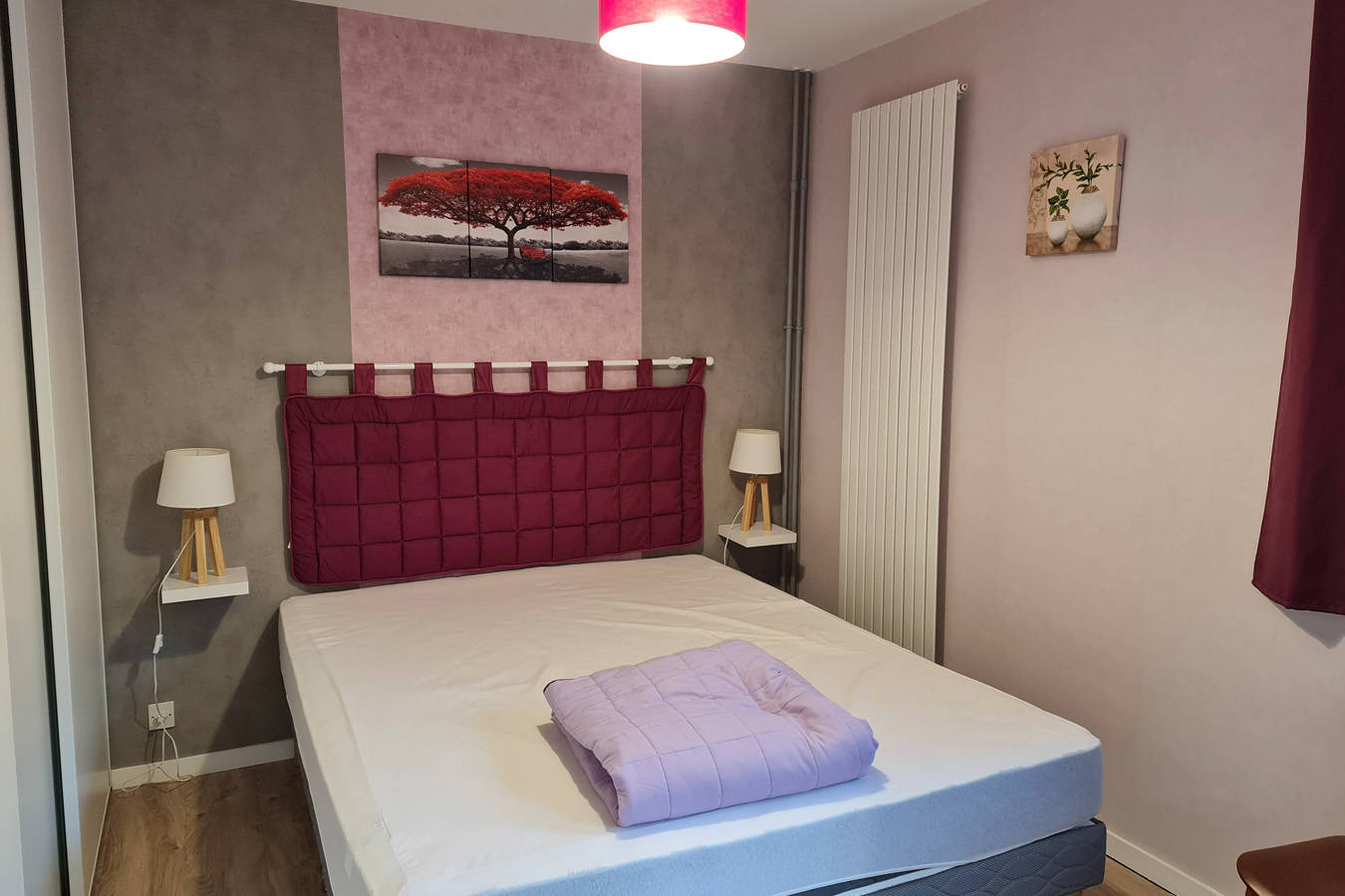 La chambre cosy et lumineuse ouvre sur le balcon. Grand placard intégré avec penderie et rayonnages, un lit de 160 cm, un chiffonnier, un fauteuil Sabot en velours, lampes de chevet, traversin et oreillers, linge de lit fourni sur demande.