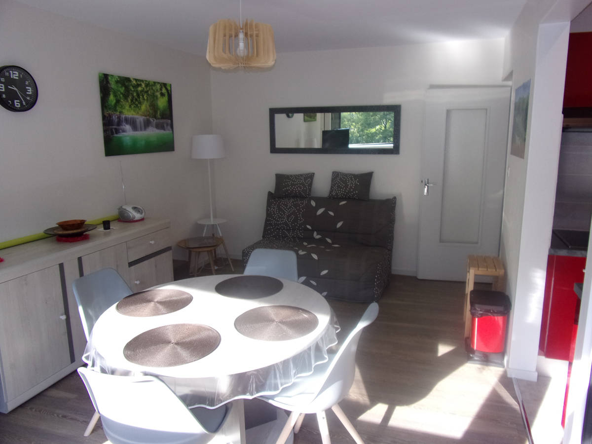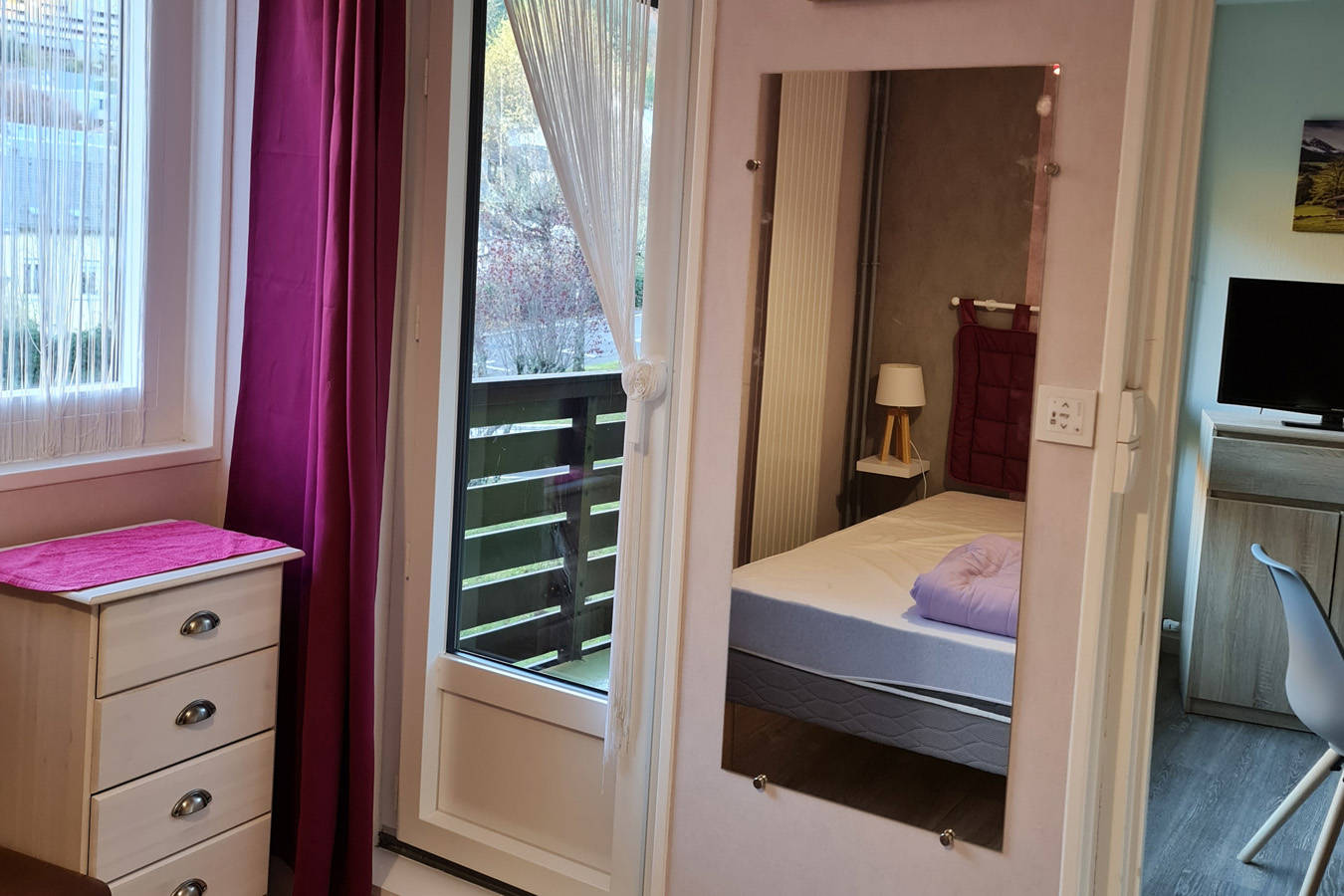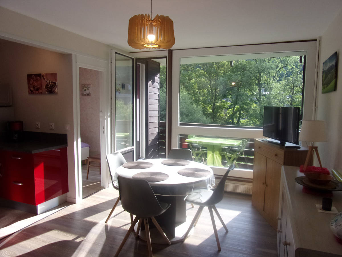 Mobilier neuf : buffet, table ronde avec rallonge, 4 chaises, BZ neuf de bon confort pour un couchage en 140, TV écran plat 80 cm. Le balcon de 5 m² avec table et 4 chaises offre une jolie vue sur le massif du Sancy et la Grande Cascade.