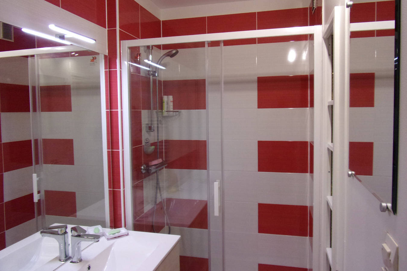 La salle d’eau a aussi bénéficié d’un réaménagement avec sa grande cabine de douche (120X70), un meuble lavabo avec vasque de 80 cm.