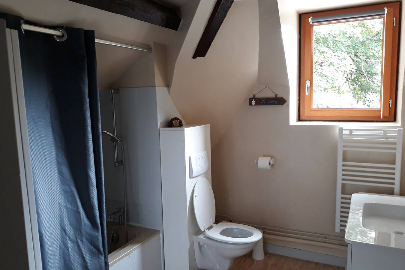 – une salle de bain, radiateur sèche serviette, wc
