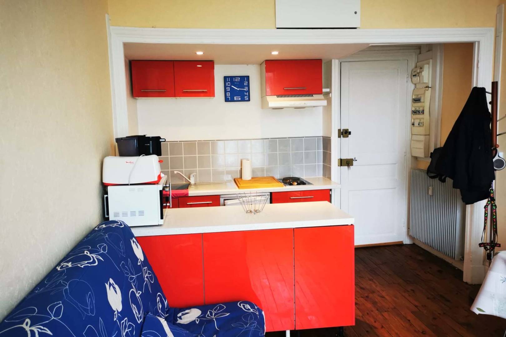 Une pièce à vivre avec coin-cuisine équipé d’un grille-pain, autocuiseur, mixeur, service à raclette, cafetière électrique, micro-ondes, deux plaques électriques et un réfrigérateur