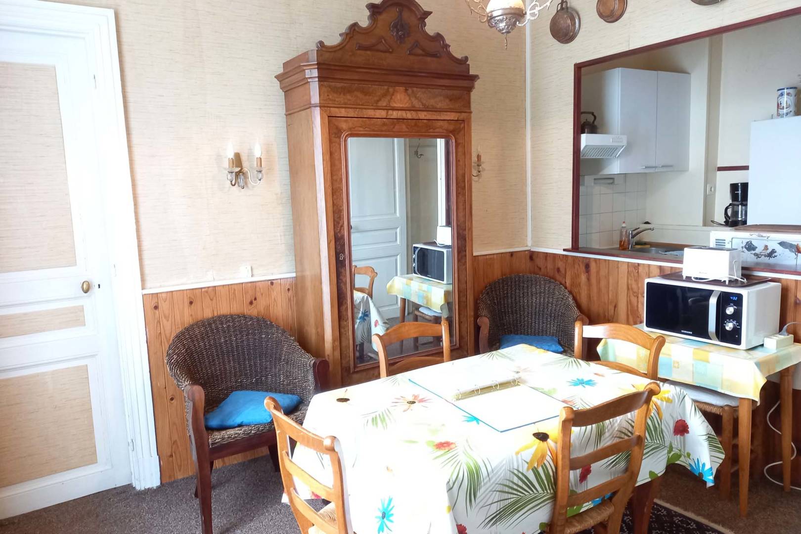 L’appartement comprend : une cuisinette bien aménagée, une salle à manger / salon avec deux fauteuils, une TV écran plat, deux chambres (l’une avec 1 lit de 140 et l’autre avec 2 lits de 90).