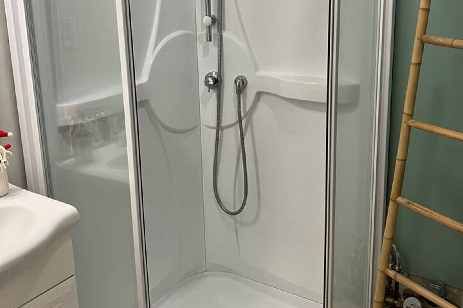 La salle de bain est agréable avec une douche spacieuse.