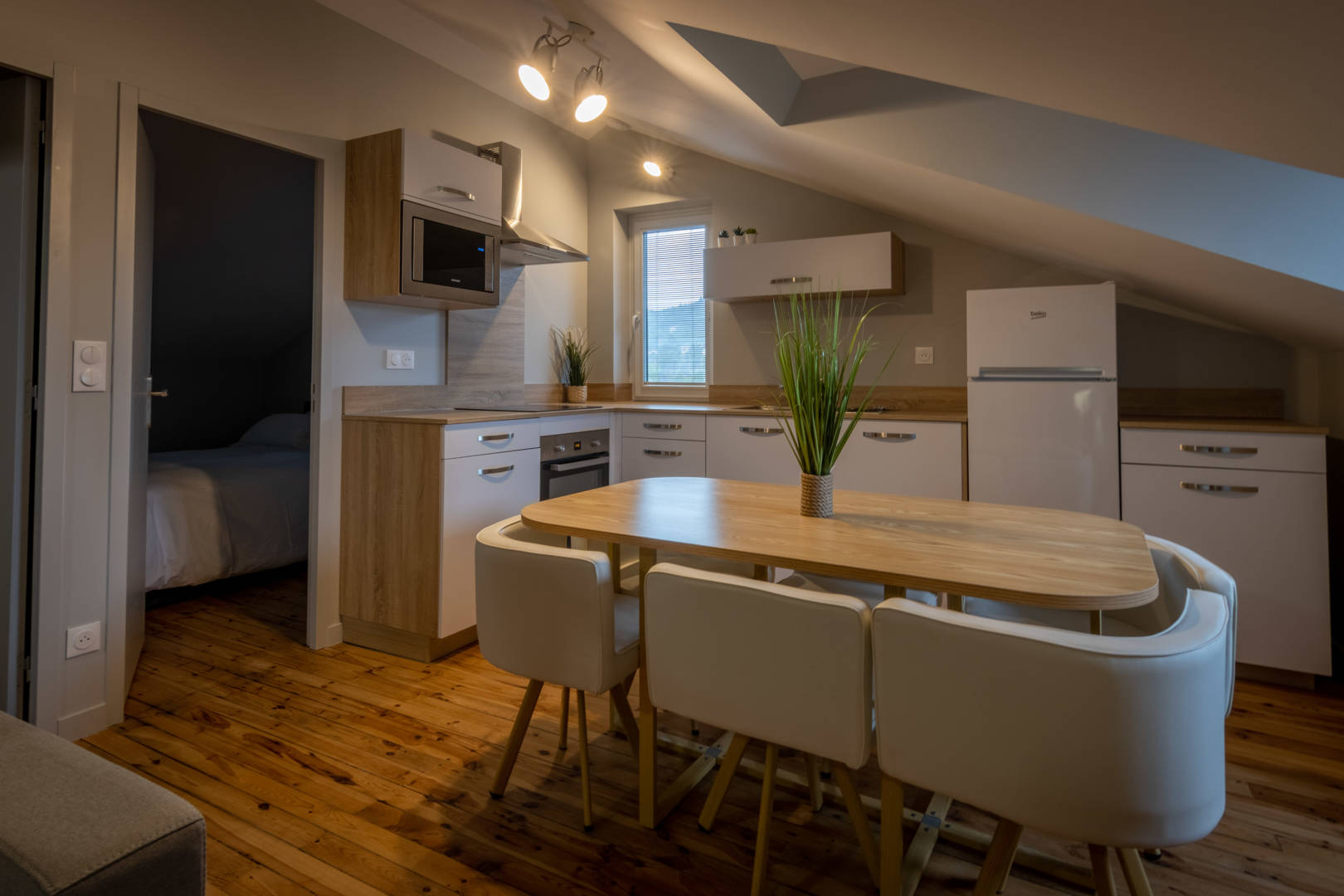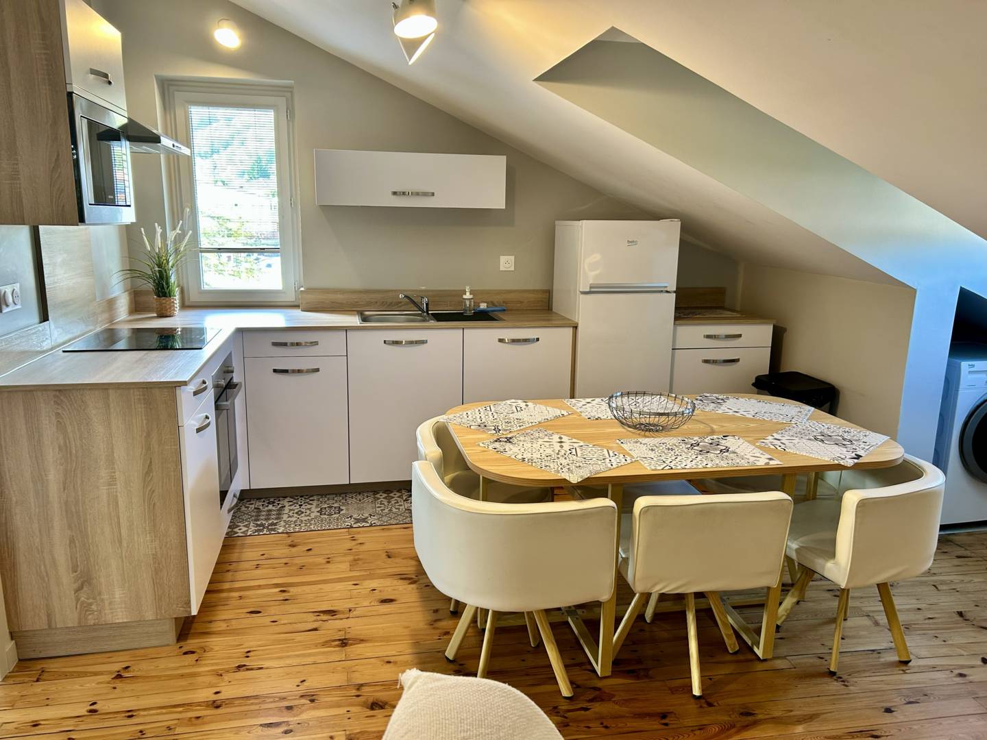 Vous y trouverez : • Un grand séjour lumineux avec fenêtres de toit, propice à la détente après vos soins thermaux • Un canapé-lit confortable offrant un couchage supplémentaire en 140 cm • Deux chambres confortables équipées de lits doubles (160 cm) pour un repos optimal • Une salle de bain agréable avec douche à l’italienne et lave-linge inclus • WC séparés pour votre confort • Une cuisine moderne entièrement équipée (plaque à induction, réfrigérateur-congélateur, four, micro-ondes, lave-vaisselle) • Climatisation, WIFI gratuit et télévision écran plat • Ascenseur dans la résidence et stationnement facile à proximité