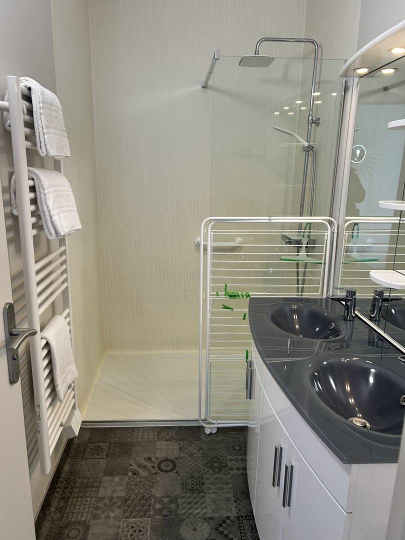 À l’intérieur, vous trouverez : • Un séjour spacieux et lumineux, avec canapé convertible et accès au balcon pour prendre l’air entre deux séances de soins. • Une chambre confortable avec lit double 160 cm, idéale pour un repos profond après vos soins. • Une salle de bain avec grande douche à l’italienne, parfaite pour la détente du corps. • Une cuisine moderne entièrement équipée pour préparer vos repas selon votre rythme. • Climatisation, WIFI et télévision écran plat inclus pour plus de confort.