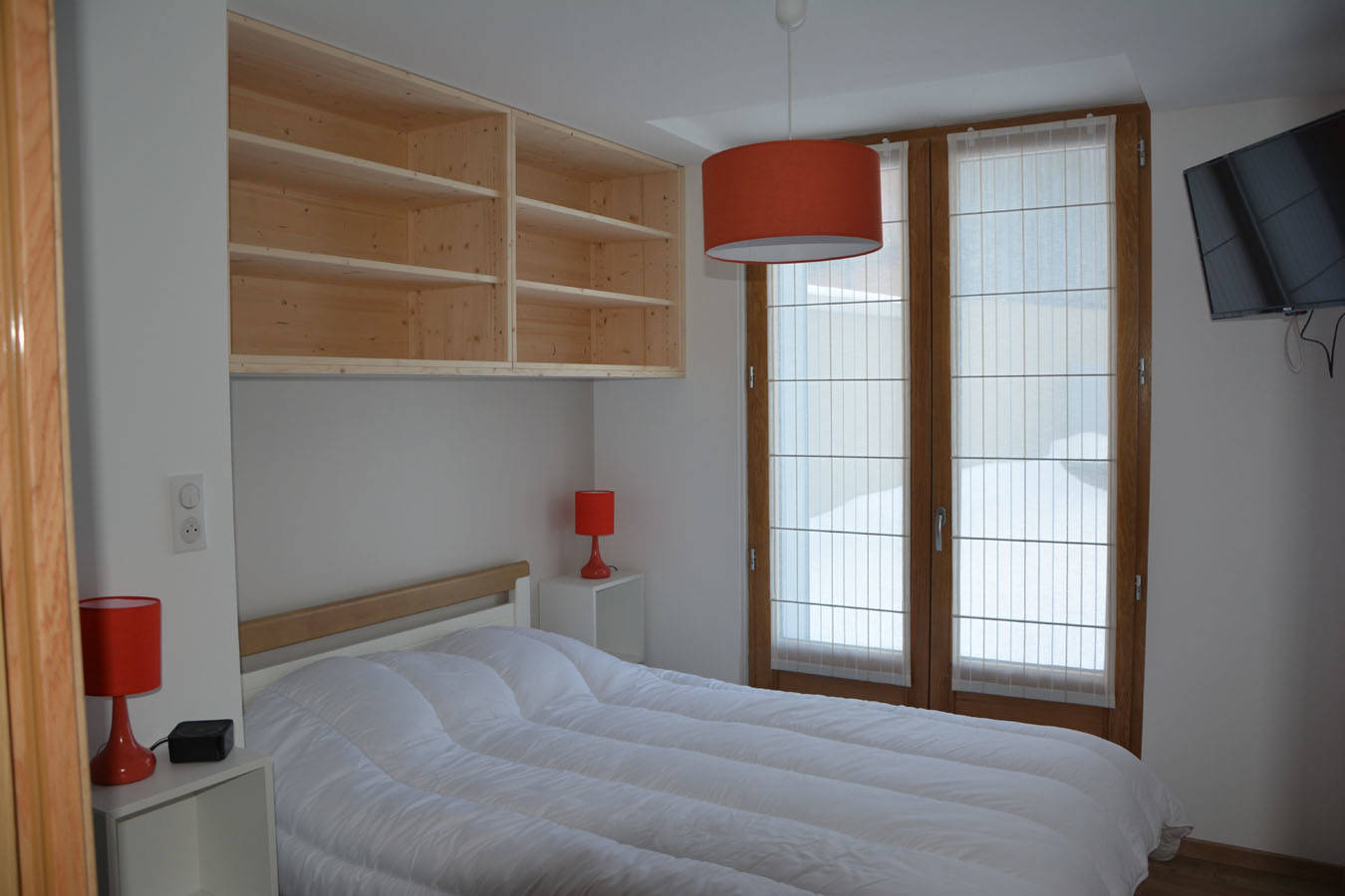1 chambre avec 1 lit de 140 cm, rangement, tiroir-lit, TV, coin douche et vasque.