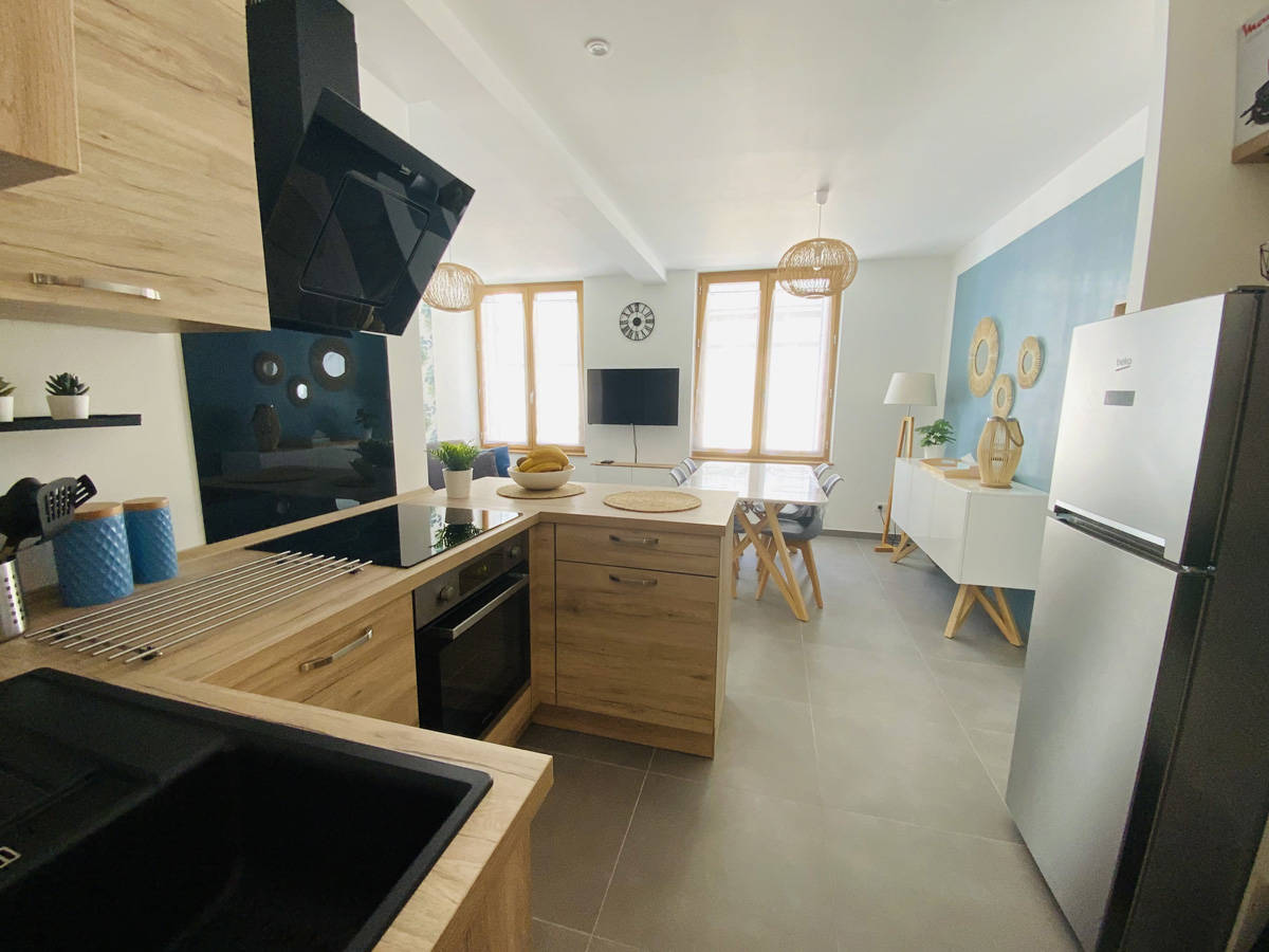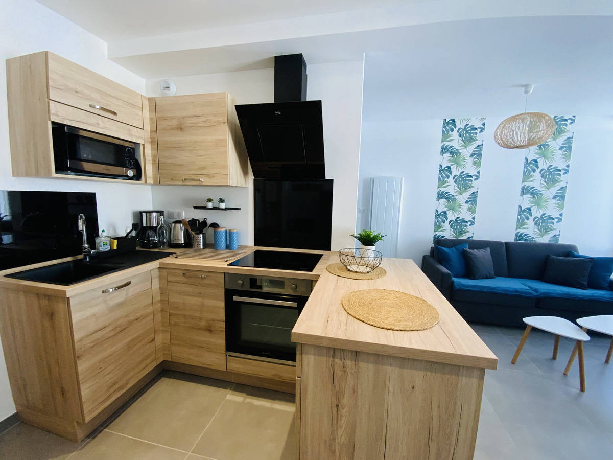 – Un sas d’entrée avec vestiaire, menant à une cuisine entièrement équipée ouverte sur l’espace de vie pour des moments conviviaux. Vous y trouverez : lave-vaisselle, plaque à induction, cafetière, bouilloire, grille-pain, micro-ondes, appareil à raclette, etc….