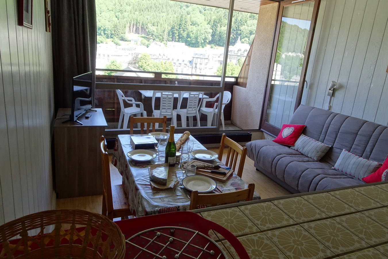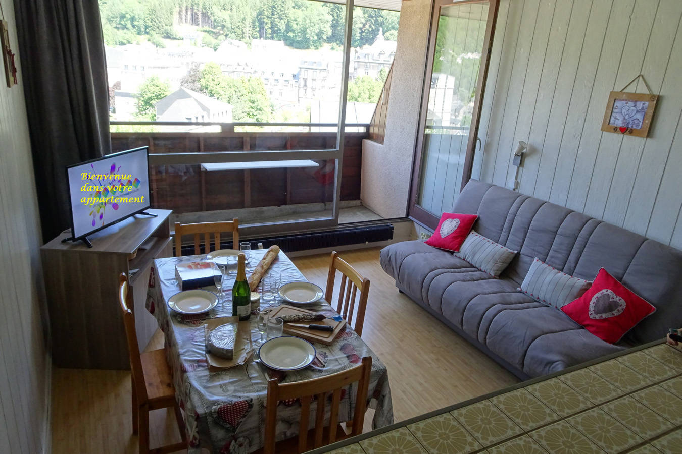 – Côté séjour : pièce très lumineuse avec coin repas (table et 6 chaises), canapé face à la télé de 80 cm, la baie vitrée donnant sur votre balcon avec vue panoramique pour déjeuner.
