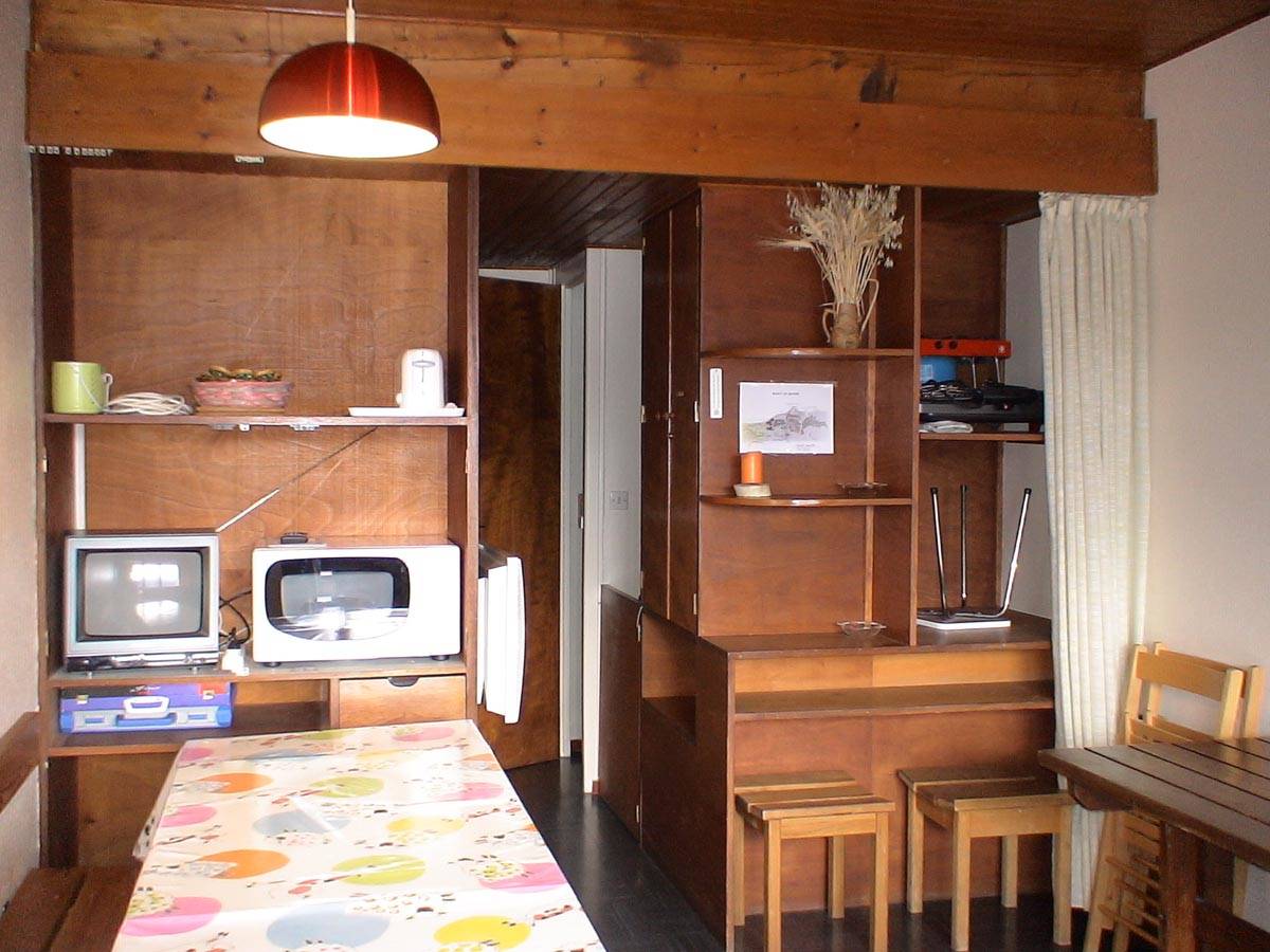 Le logement est composé au niveau supérieur d’une petite cuisine d’une salle d’eau avec cabine de douche, d’un WC séparé et d’un salon qui donne directement sur le balcon, équipé d’une table et d’un clic-clac. Au niveau inférieur vous disposerez d’une chambre équipée d’un lit gigogne et d’un lit superposé. Construit à flan de montagne les deux niveaux sont de plein pied.
