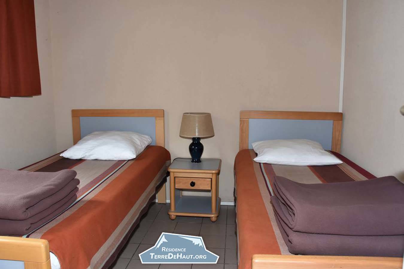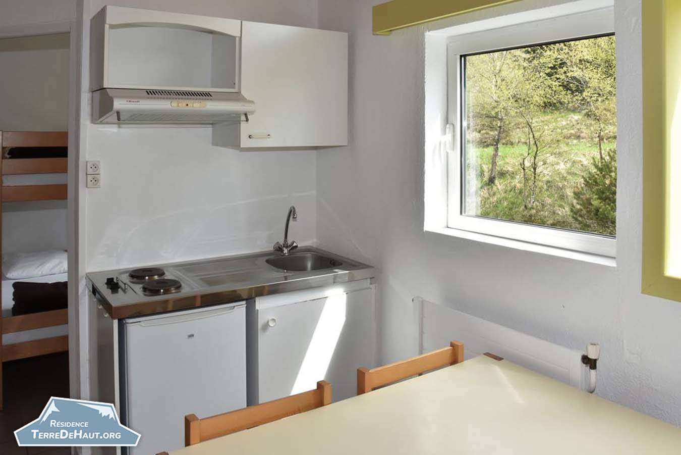 L’appartement comprend 2 chambres, une salle d’eau/WC, et possède une cuisine avec plaques électriques, un four à micro-onde et un réfrigérateur.